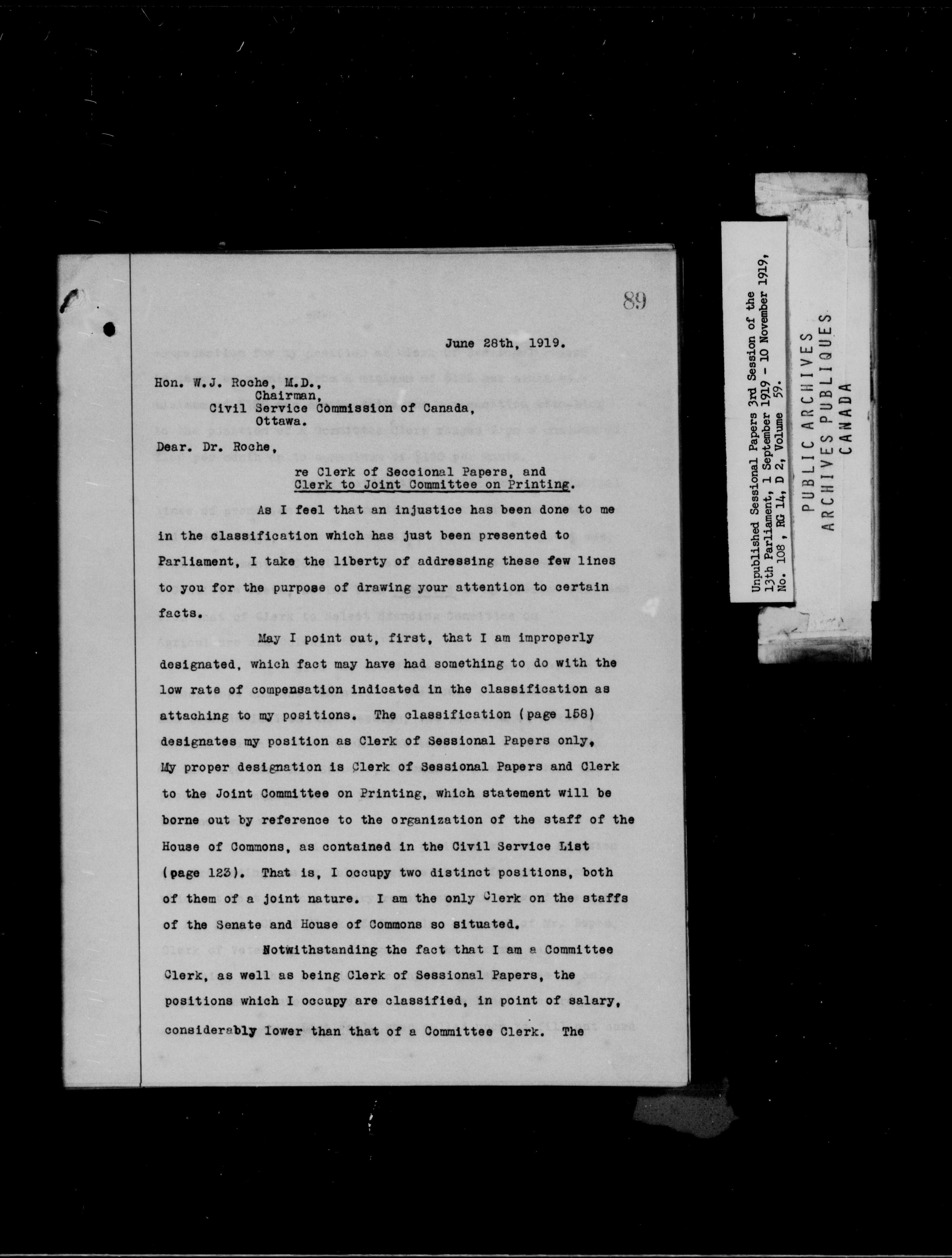 Unpublished Sessional Papers; 3rd Session of the 13th Parliament, 1 Sept. 1919-10 Nov. 1919 - 6946