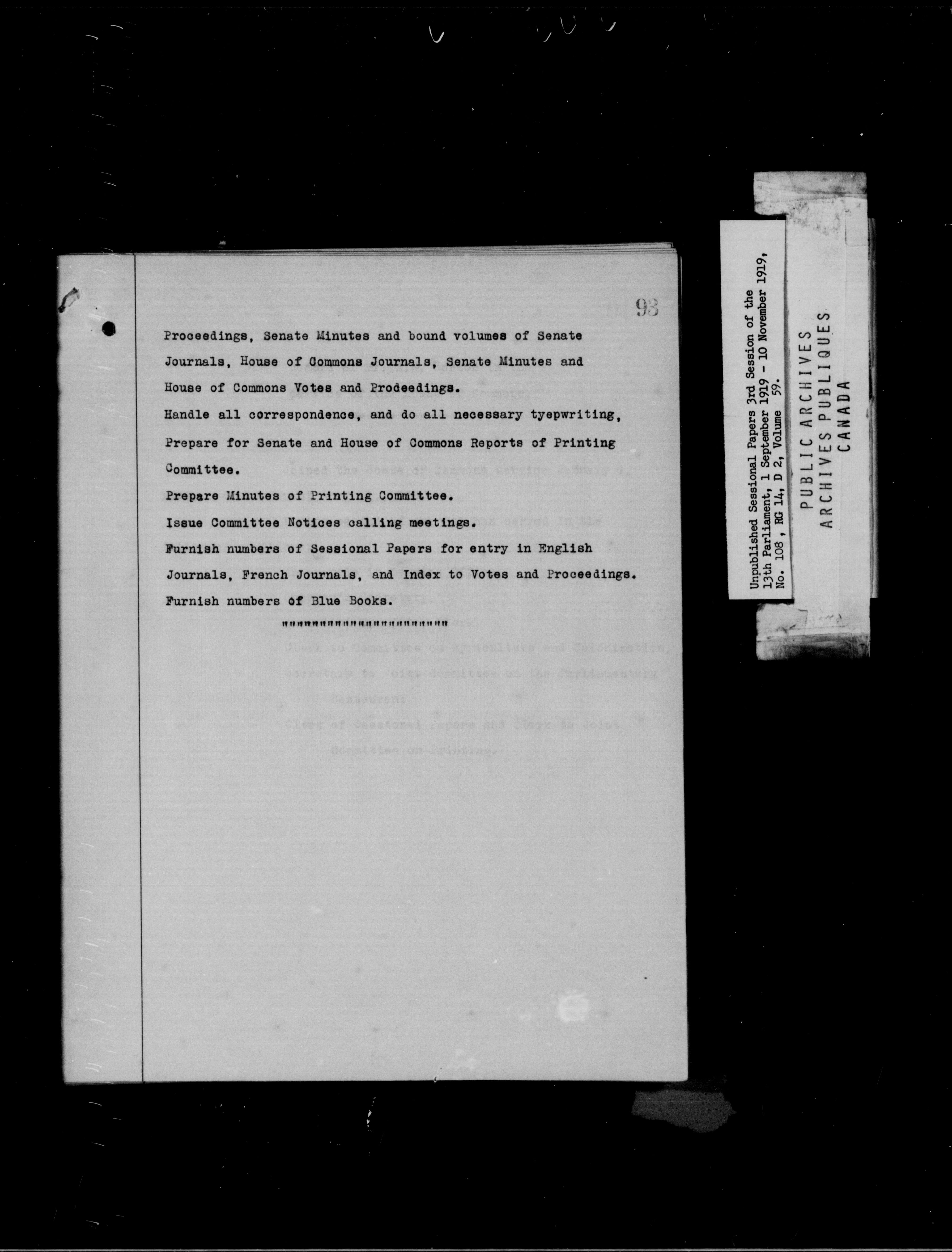 Unpublished Sessional Papers; 3rd Session of the 13th Parliament, 1 Sept. 1919-10 Nov. 1919 - 6946