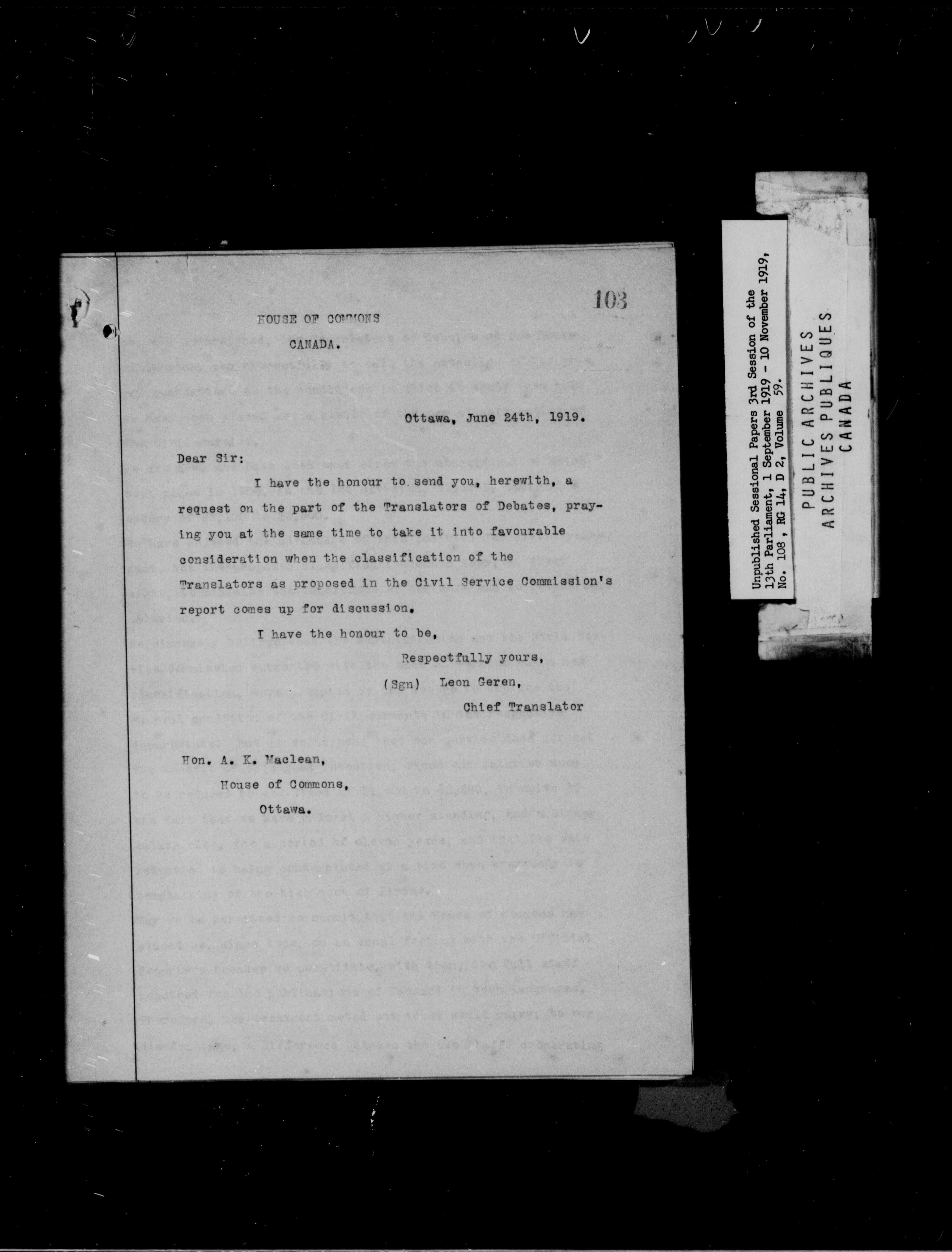 Unpublished Sessional Papers; 3rd Session of the 13th Parliament, 1 Sept. 1919-10 Nov. 1919 - 6946