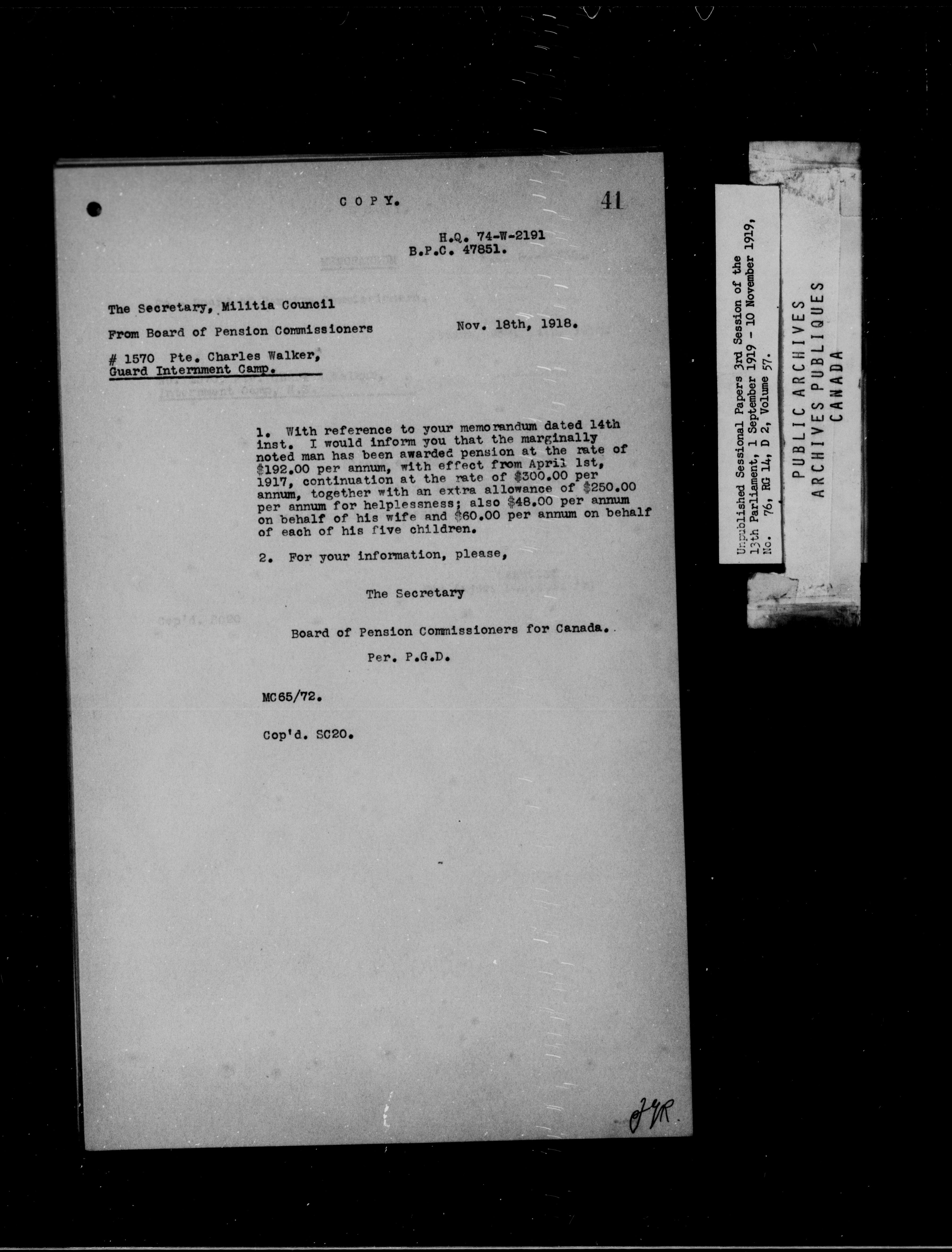 Unpublished Sessional Papers; 3rd Session of the 13th Parliament, 1 Sept. 1919-10 Nov. 1919 - 6946