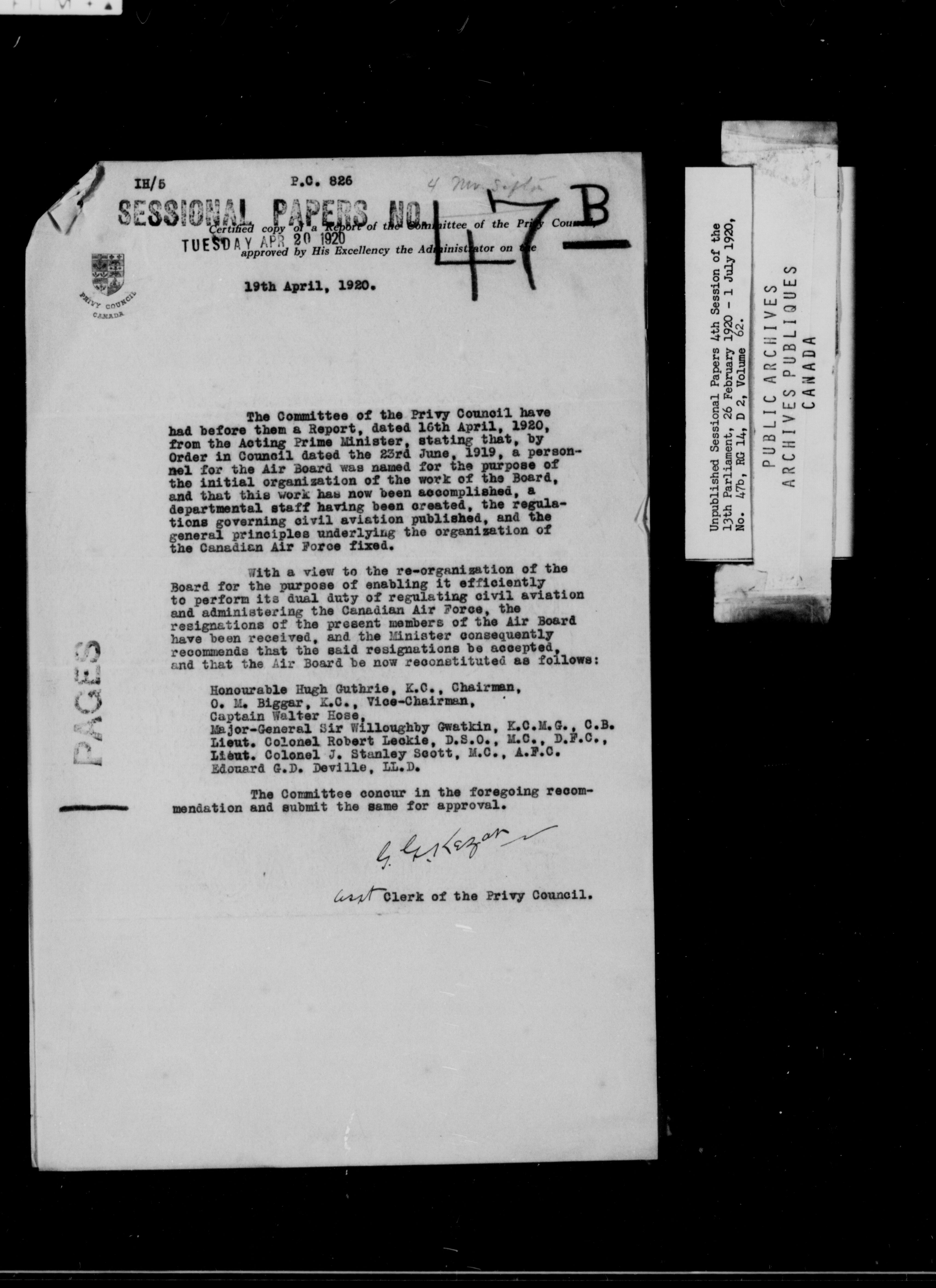 Unpublished Sessional Papers, 4th Session of the 13th Parliament, 26 Feb. 1920-1 July 1920 - 6947