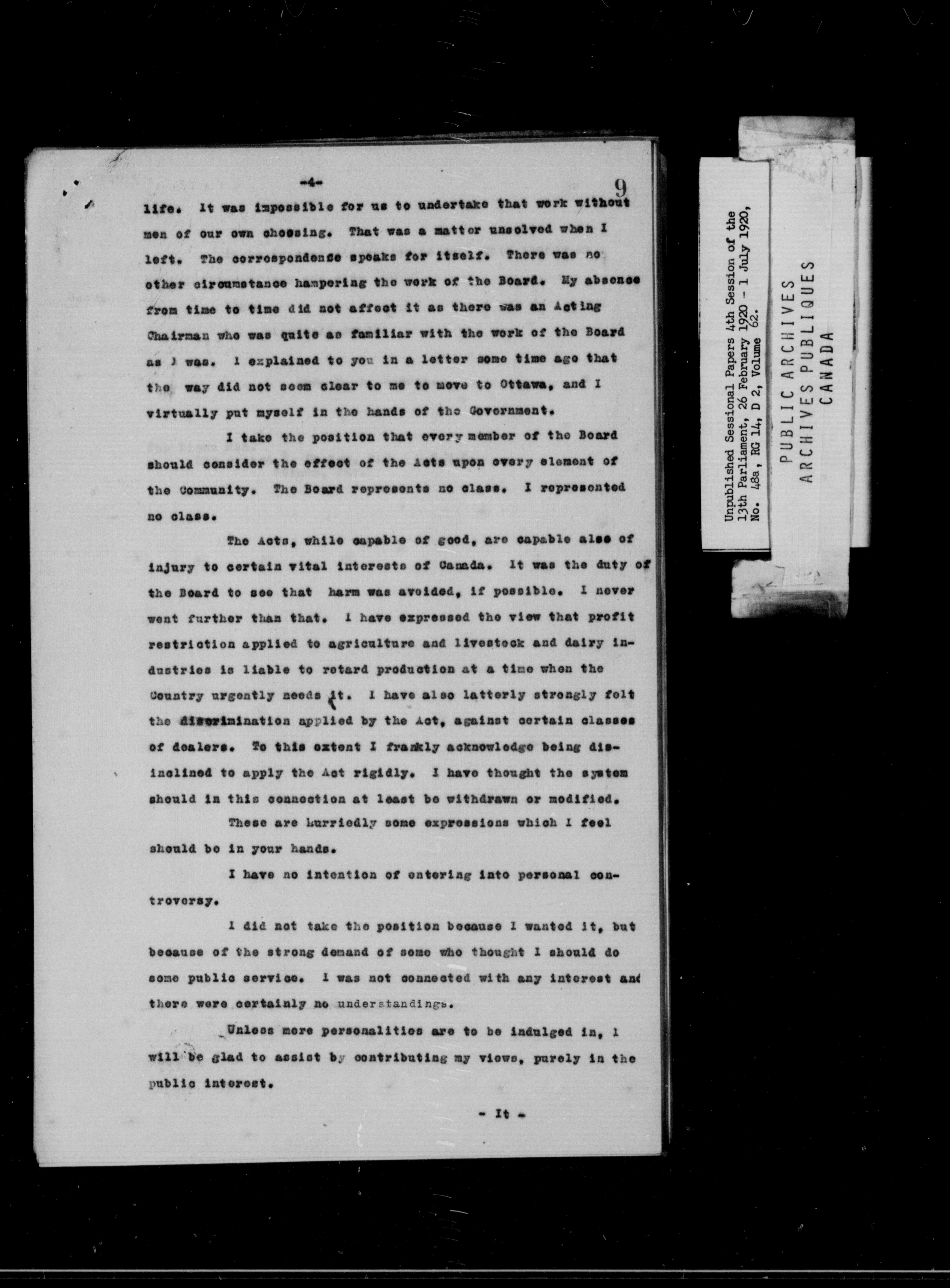 Unpublished Sessional Papers, 4th Session of the 13th Parliament, 26 Feb. 1920-1 July 1920 - 6947