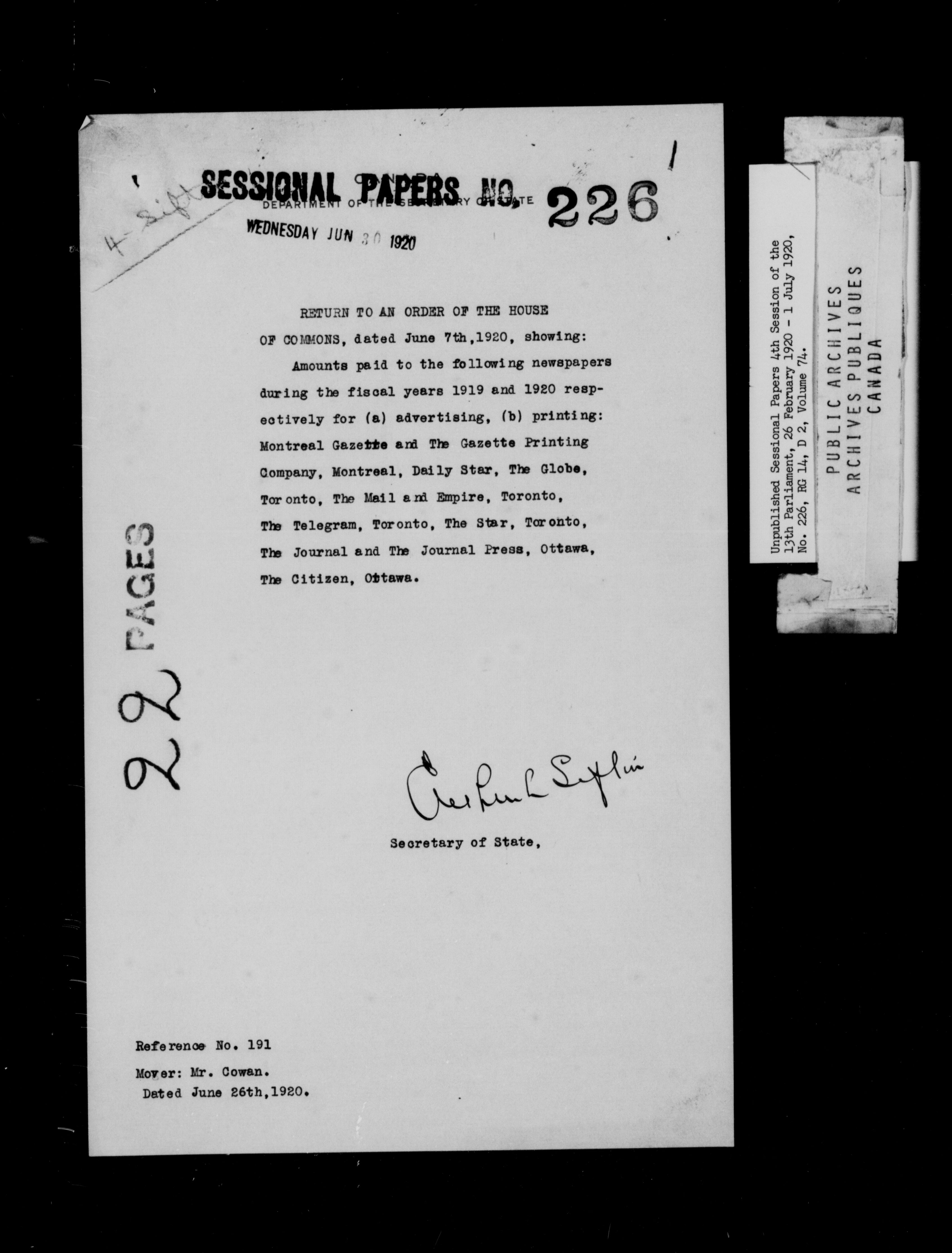 Unpublished Sessional Papers; 4th Session of the 13th Parliament, 26 Feb. 1920-1 July 1920 - 6954