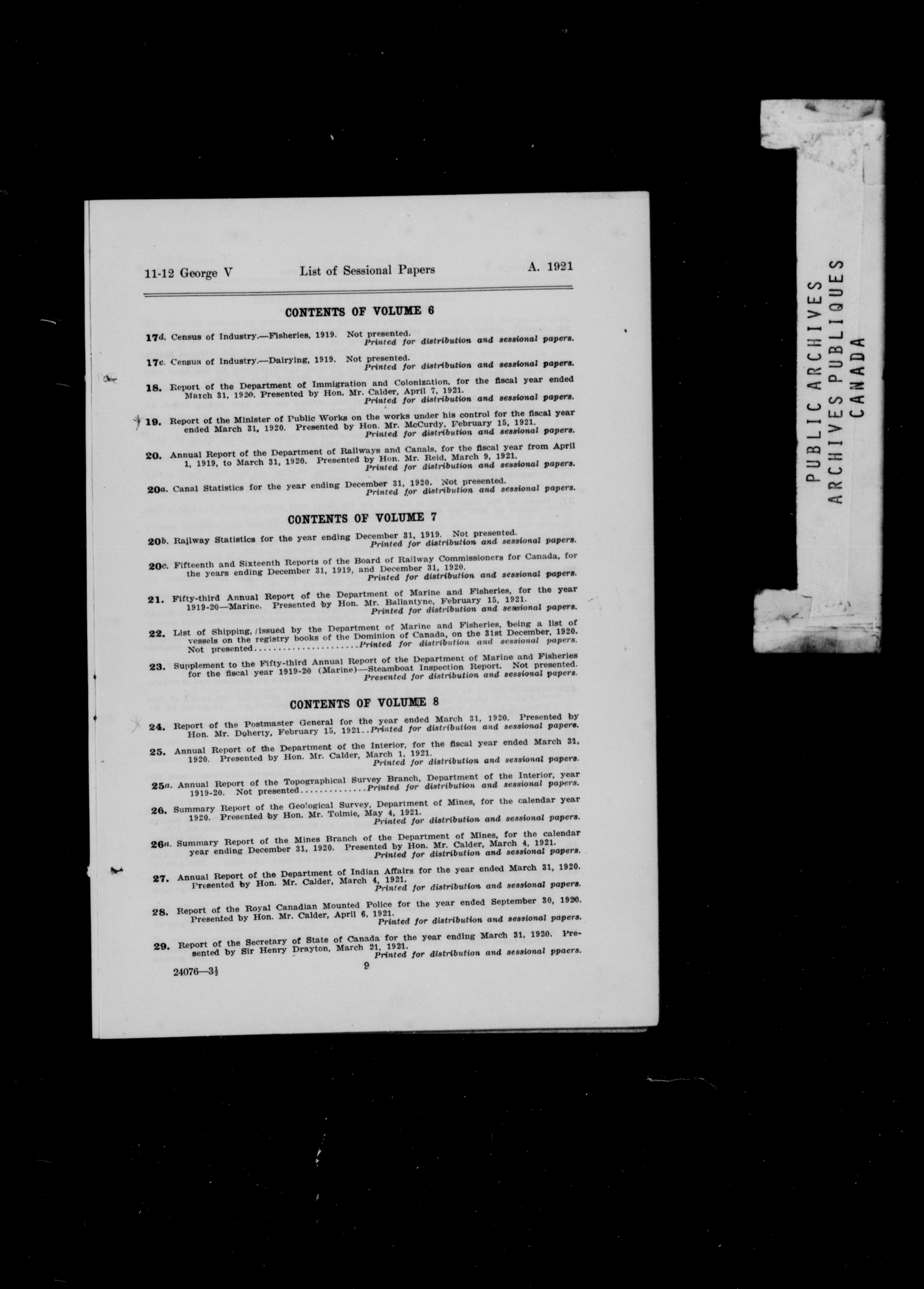 Unpublished Sessional Papers; 4th Session of the 13th Parliament, 26 Feb. 1920-1 July 1920 - 6954