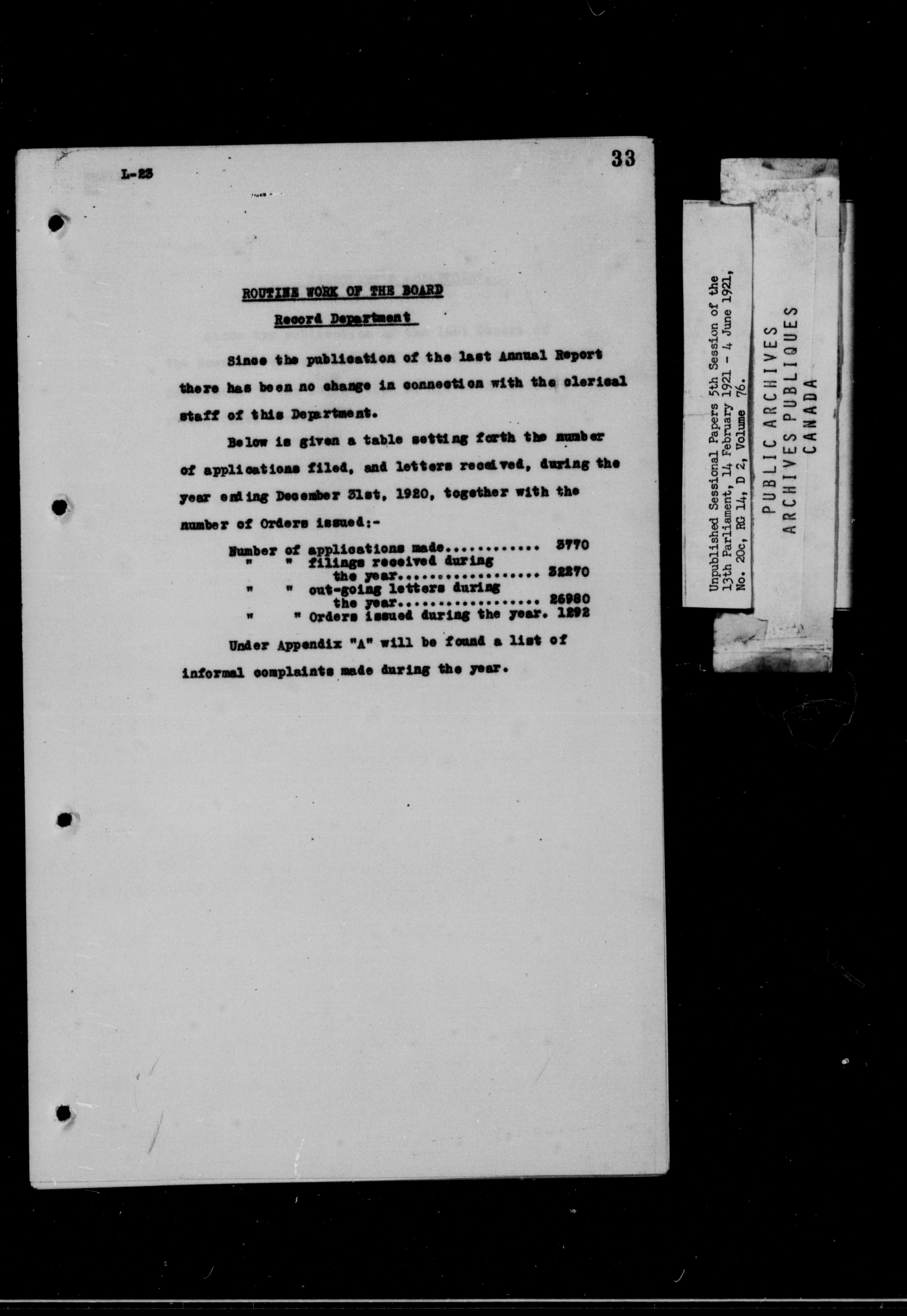 Unpublished Sessional Papers; 5th Session of the 13th Parliament, 14 Feb. 1921-4 June 1921 - 6955