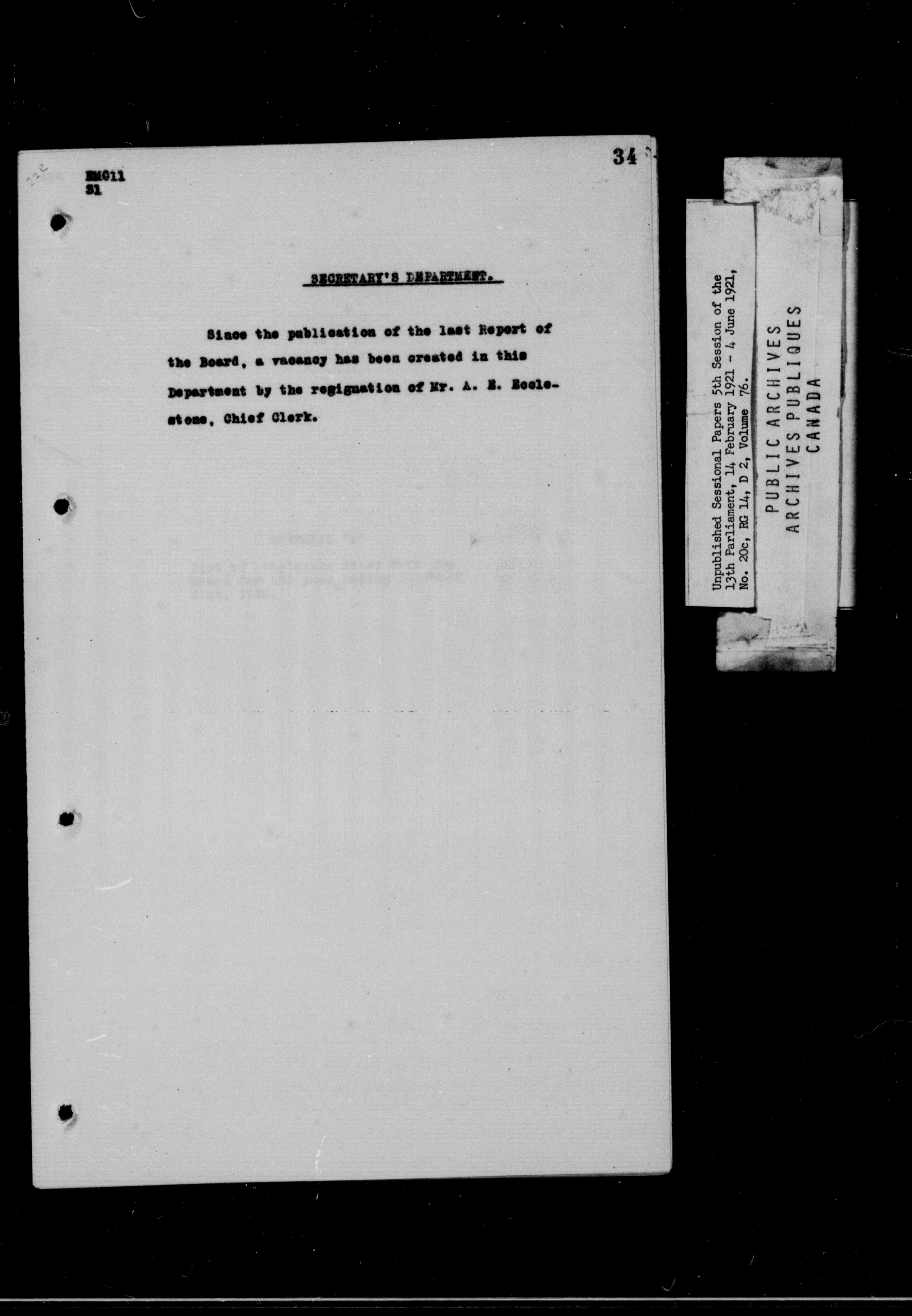 Unpublished Sessional Papers; 5th Session of the 13th Parliament, 14 Feb. 1921-4 June 1921 - 6955