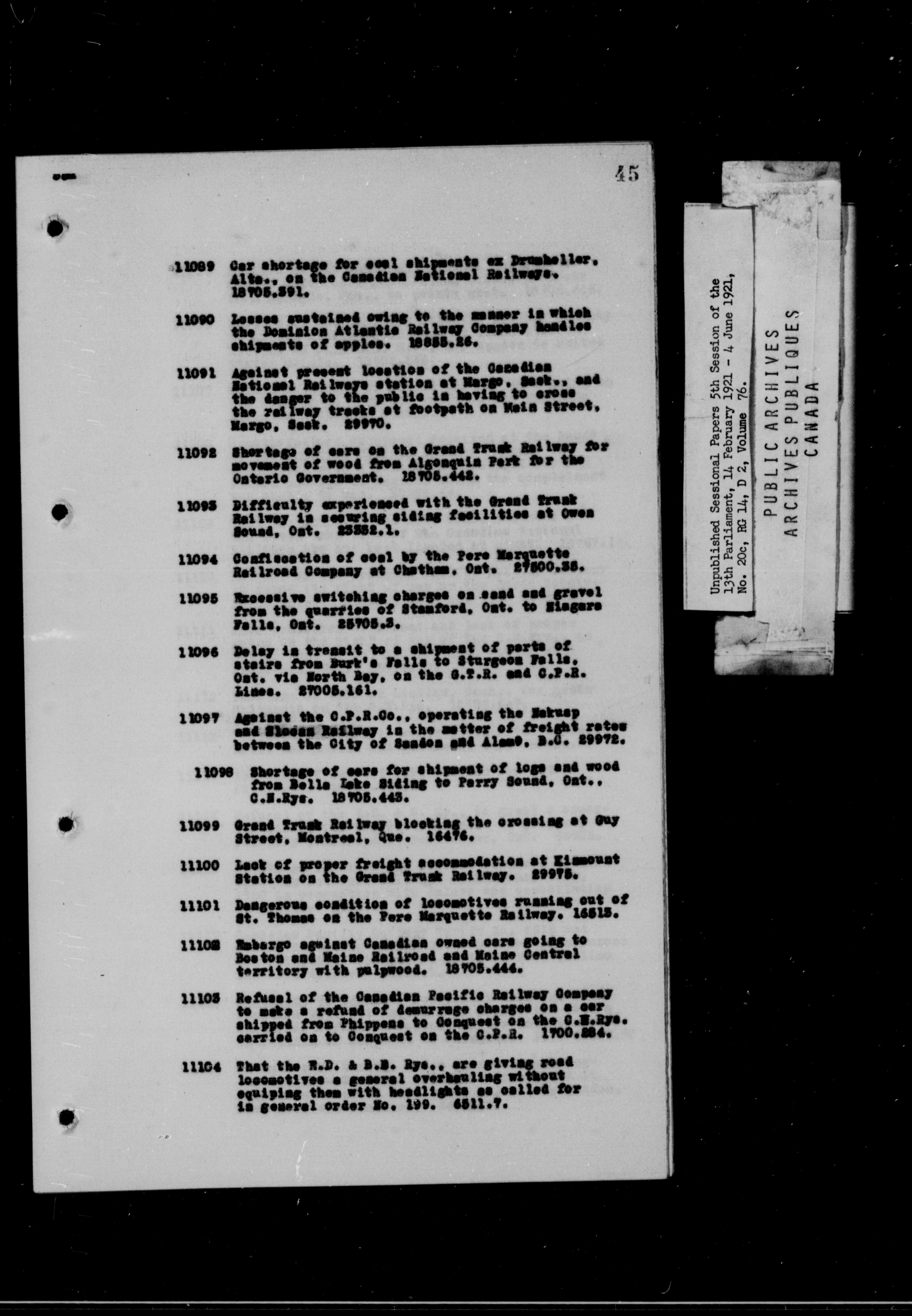 Unpublished Sessional Papers; 5th Session of the 13th Parliament, 14 Feb. 1921-4 June 1921 - 6955