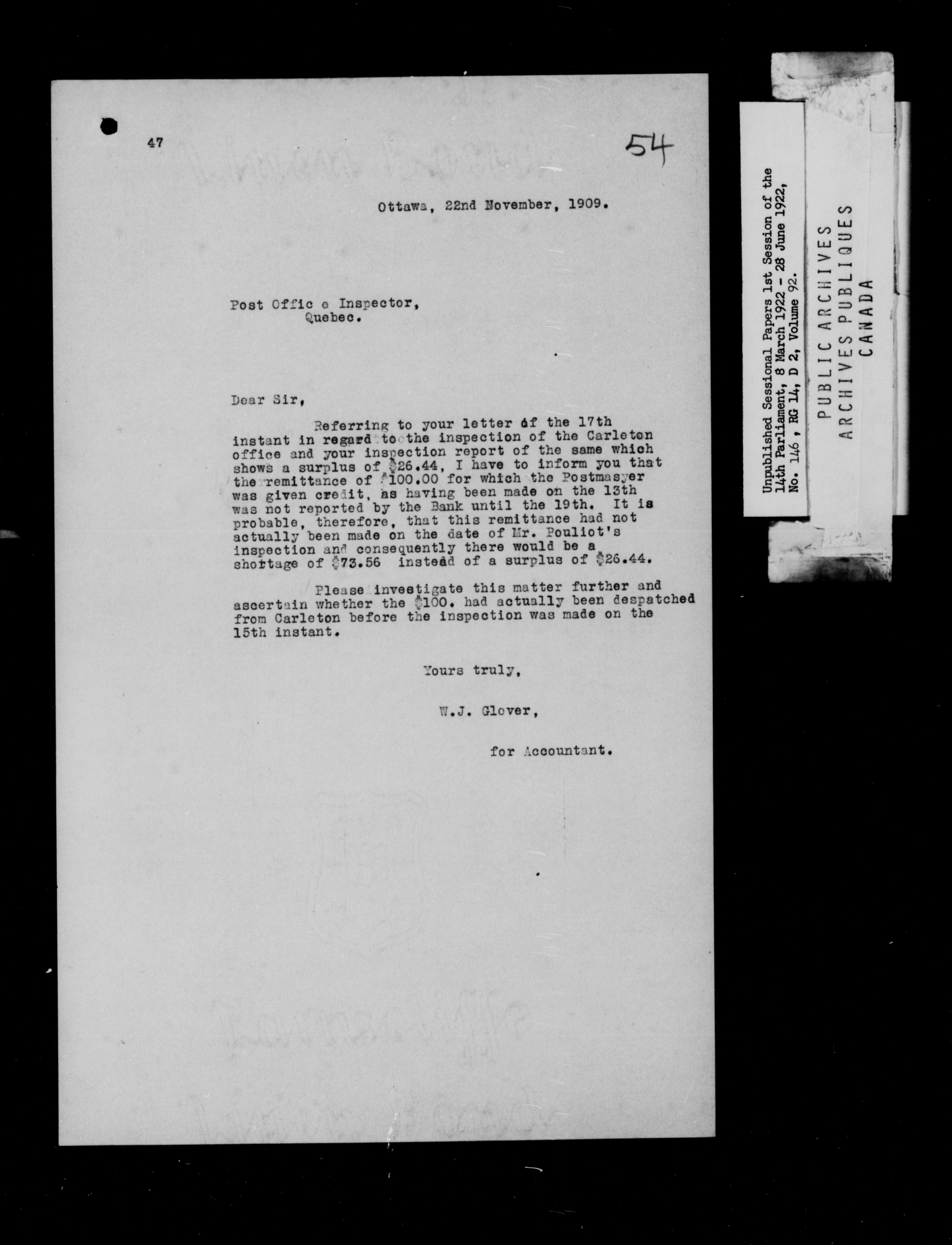 Unpublished Sessional Papers; 1st Session of the 14th Parliament, 8 March 1922-28 June 1922 - 6962