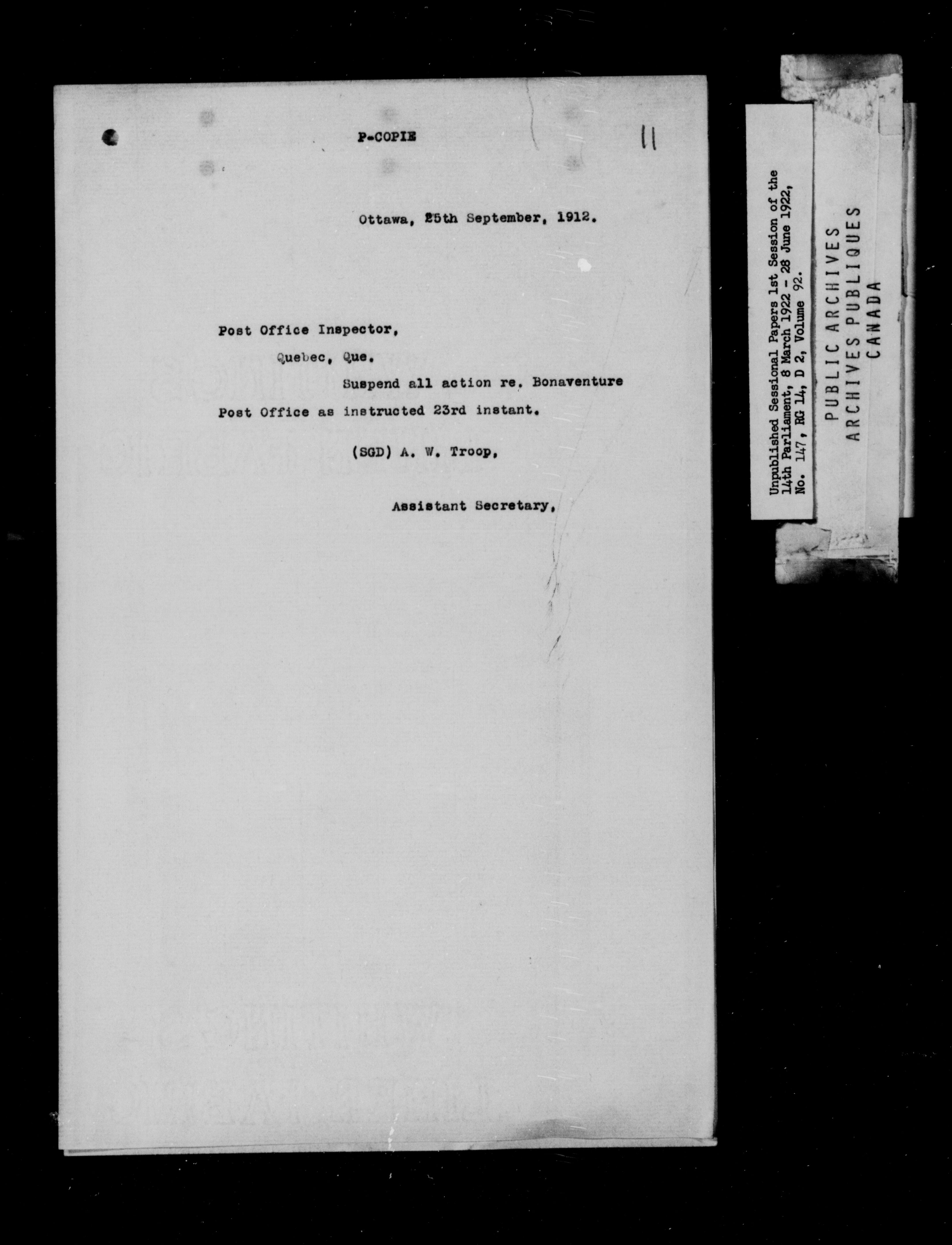 Unpublished Sessional Papers; 1st Session of the 14th Parliament, 8 March 1922-28 June 1922 - 6962