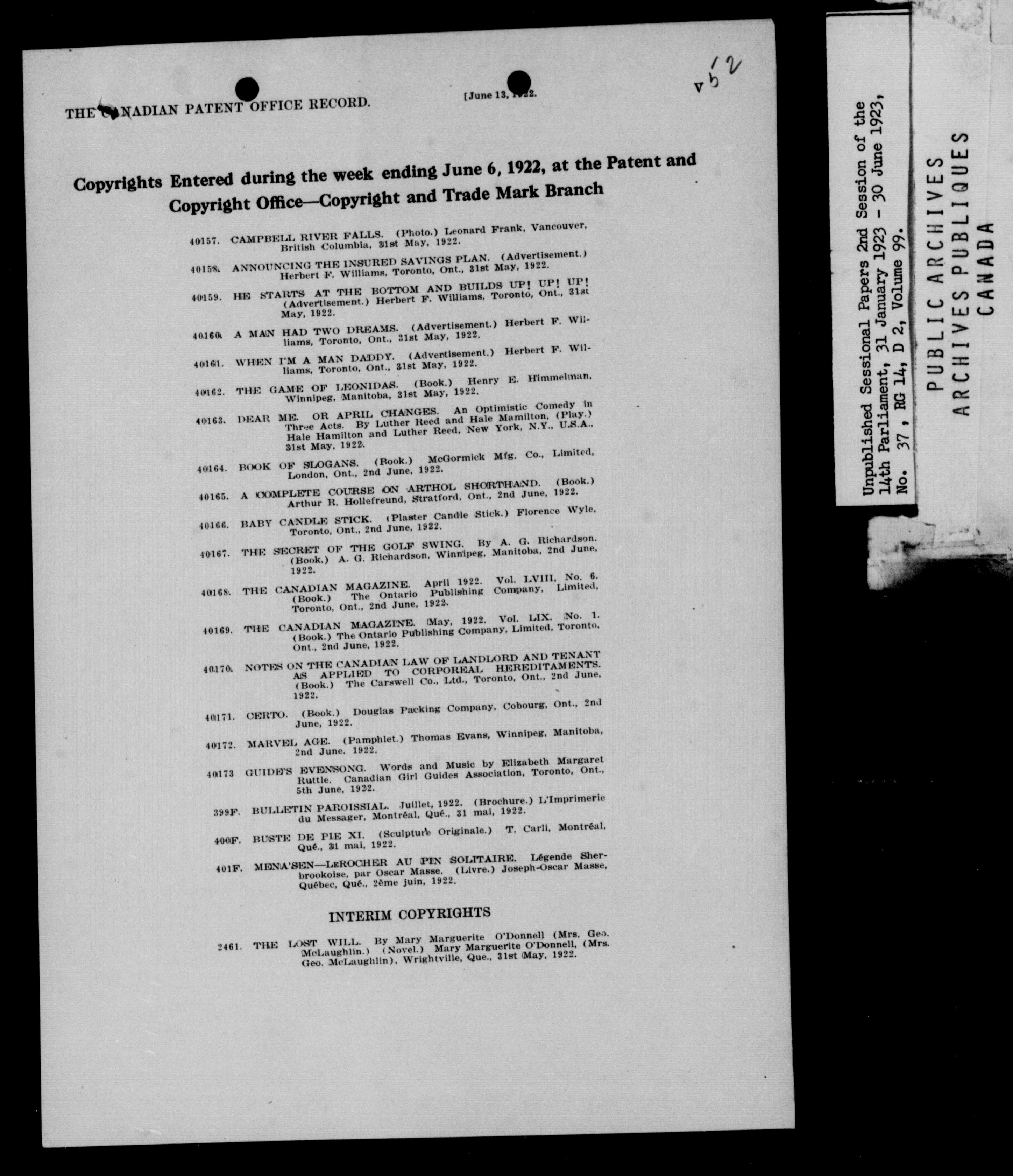 Unpublished Sessional Papers; 2nd Session of the 14th Parliament, 31 Jan. 1923-30 June 1923 - 6965