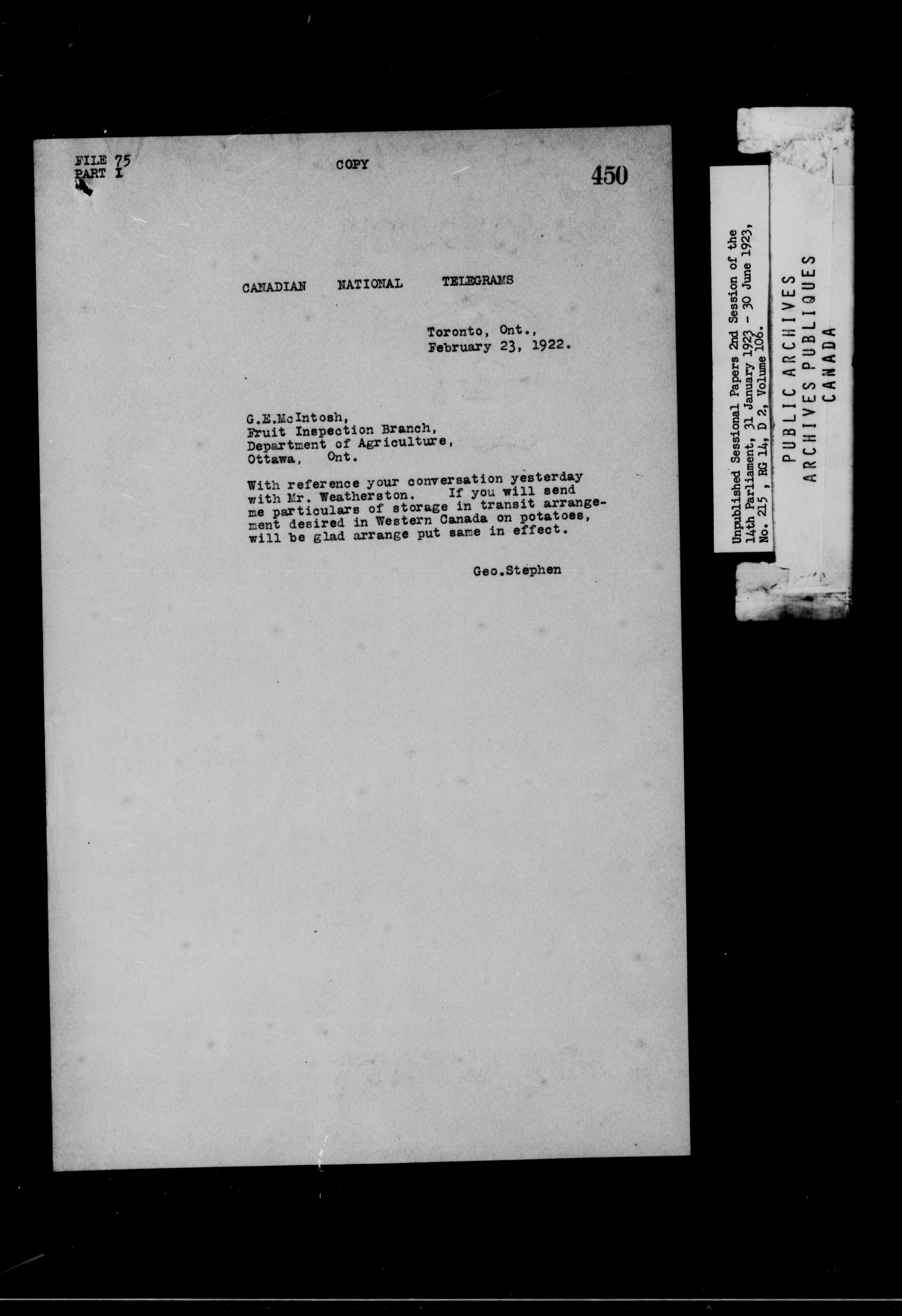 Unpublished Sessional Papers; 2nd Session of the 14th Parliament, 31 Jan. 1923-30 June 1923 - 6968