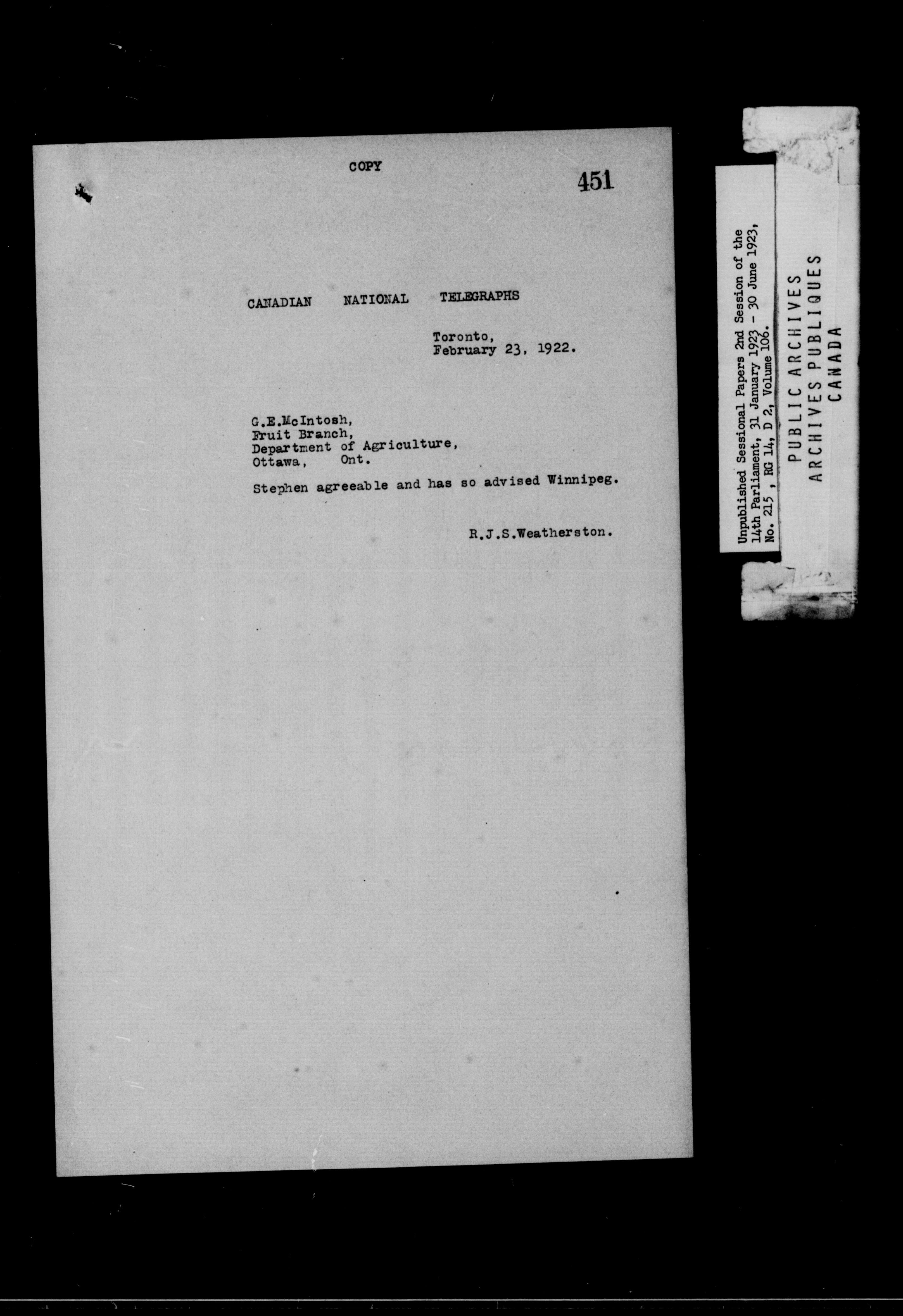 Unpublished Sessional Papers; 2nd Session of the 14th Parliament, 31 Jan. 1923-30 June 1923 - 6968