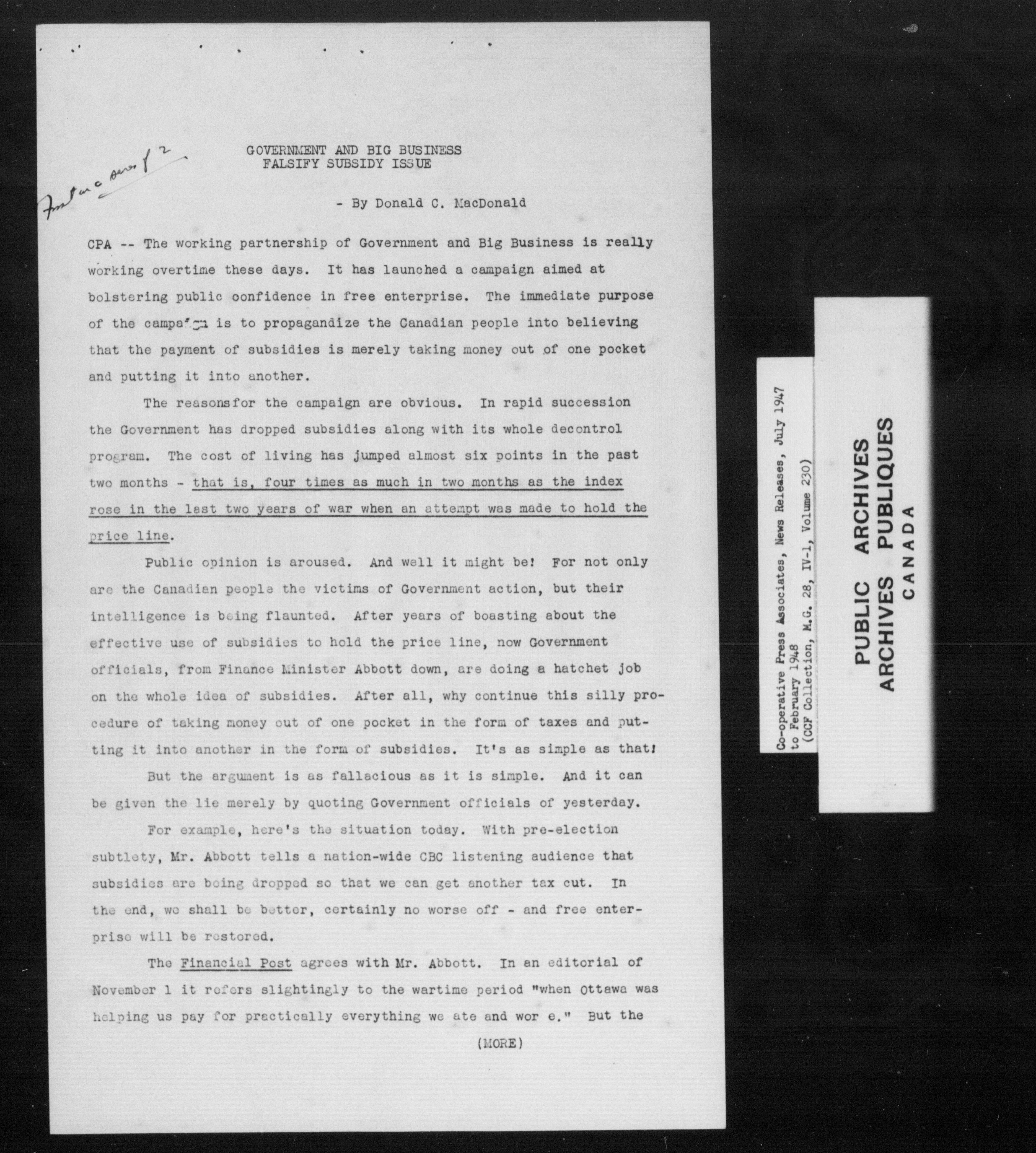 Co-operative Commonwealth Federation (MG 28, IV I) Co-operative Press associates News Releases (1944-1960) - 7022