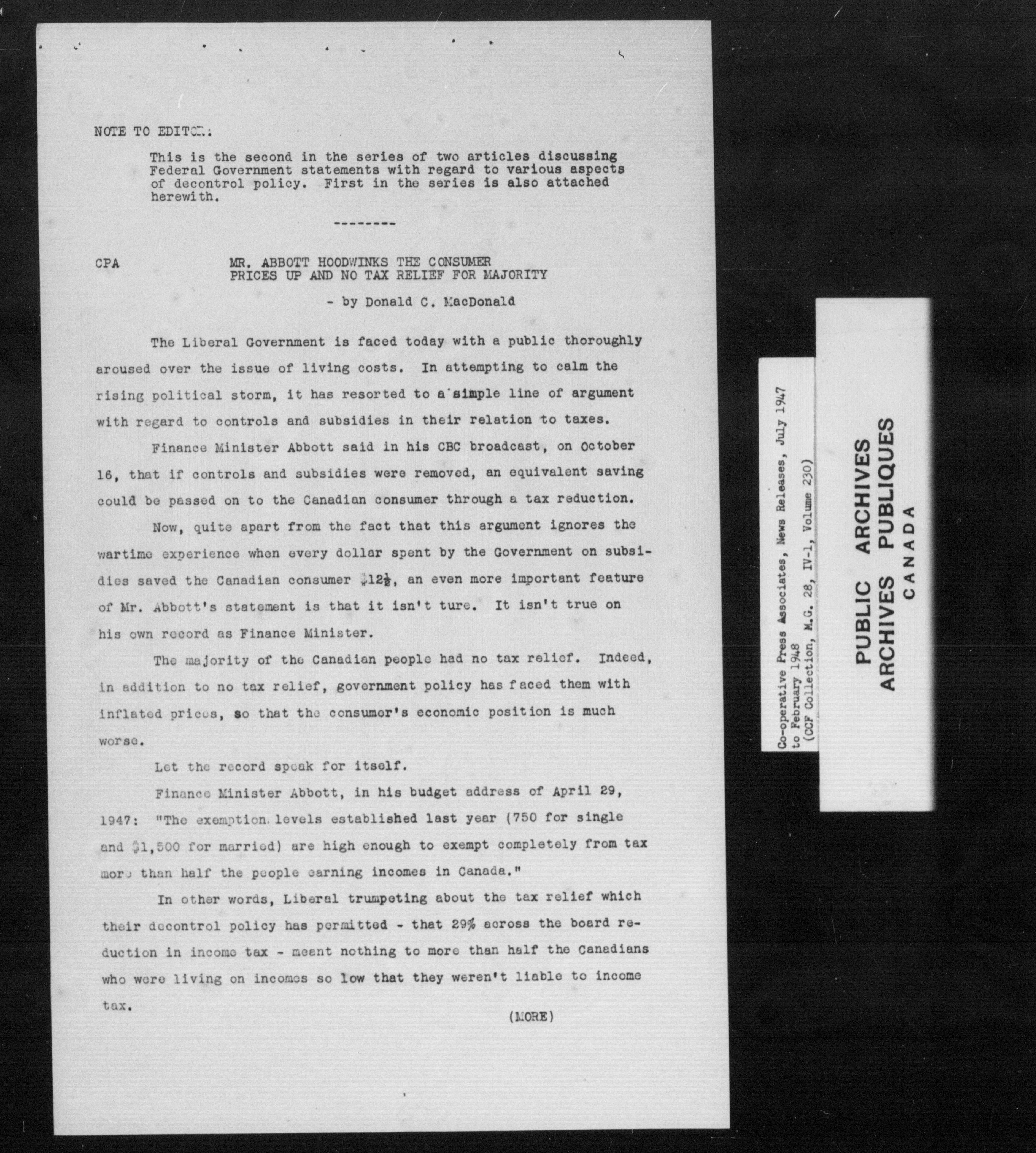 Co-operative Commonwealth Federation (MG 28, IV I) Co-operative Press associates News Releases (1944-1960) - 7022