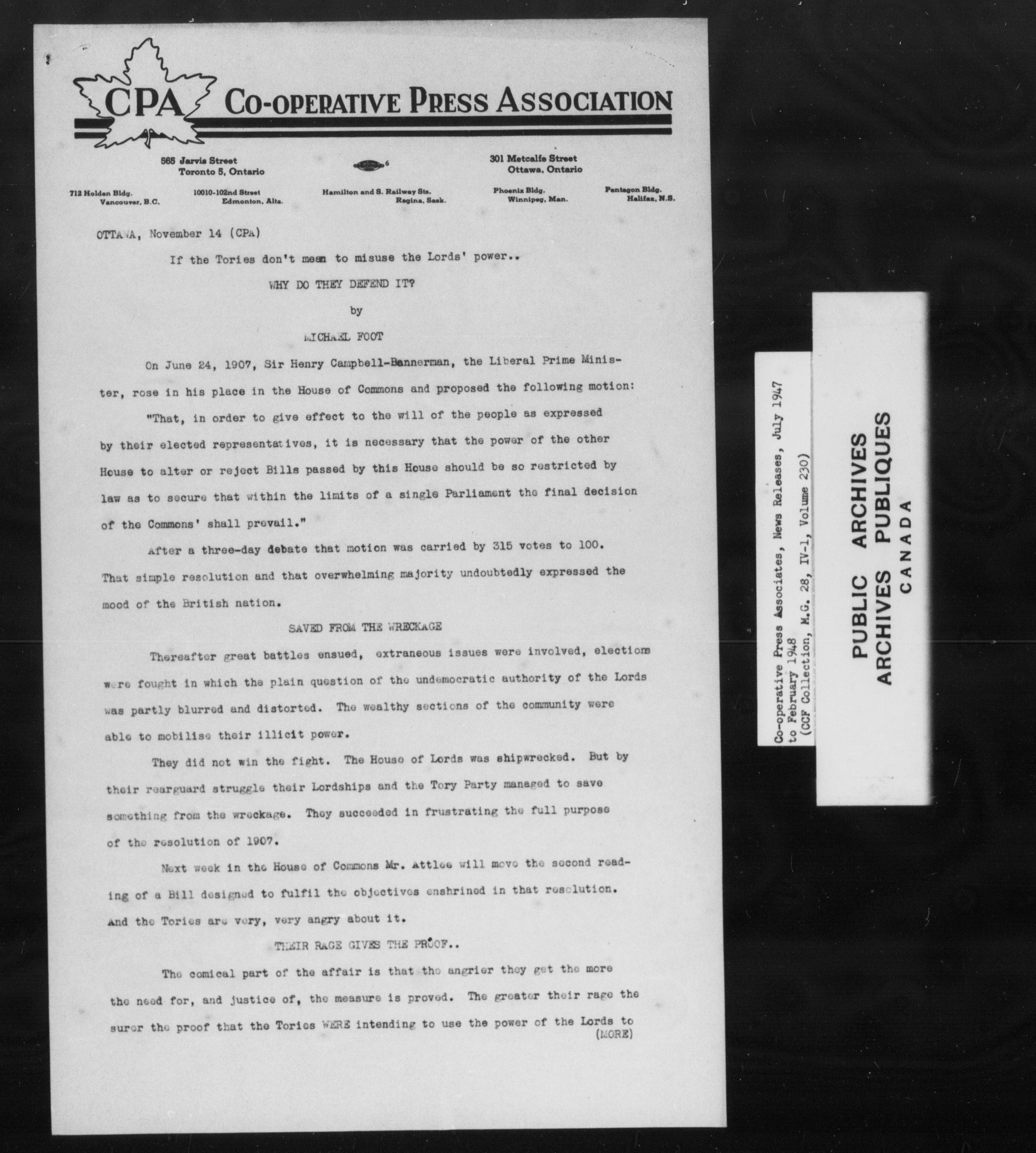 Co-operative Commonwealth Federation (MG 28, IV I) Co-operative Press associates News Releases (1944-1960) - 7022
