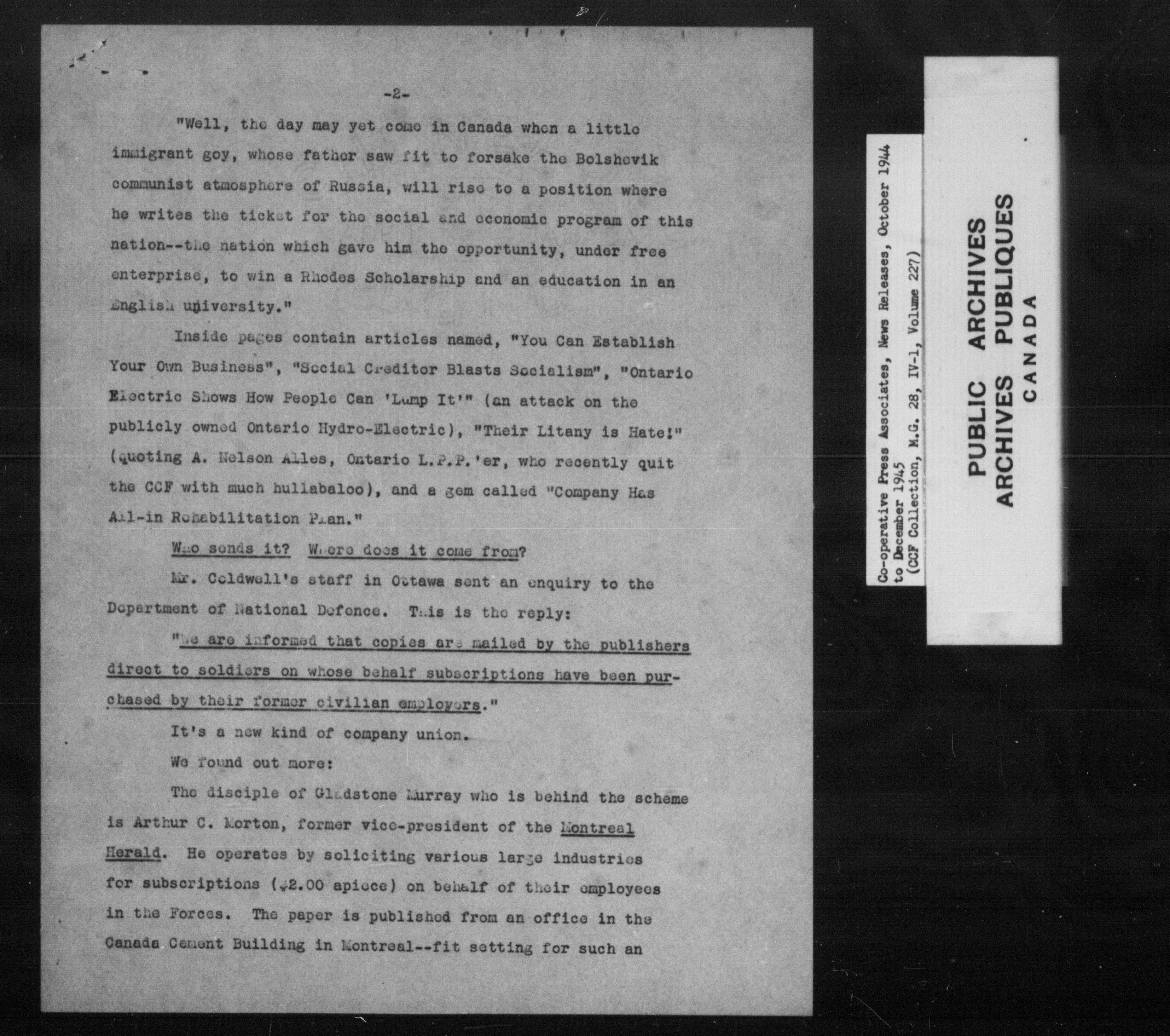 Co-operative Commonwealth Federation (MG 28, IV I) Co-operative Press associates News Releases (1944-1960) - 7022