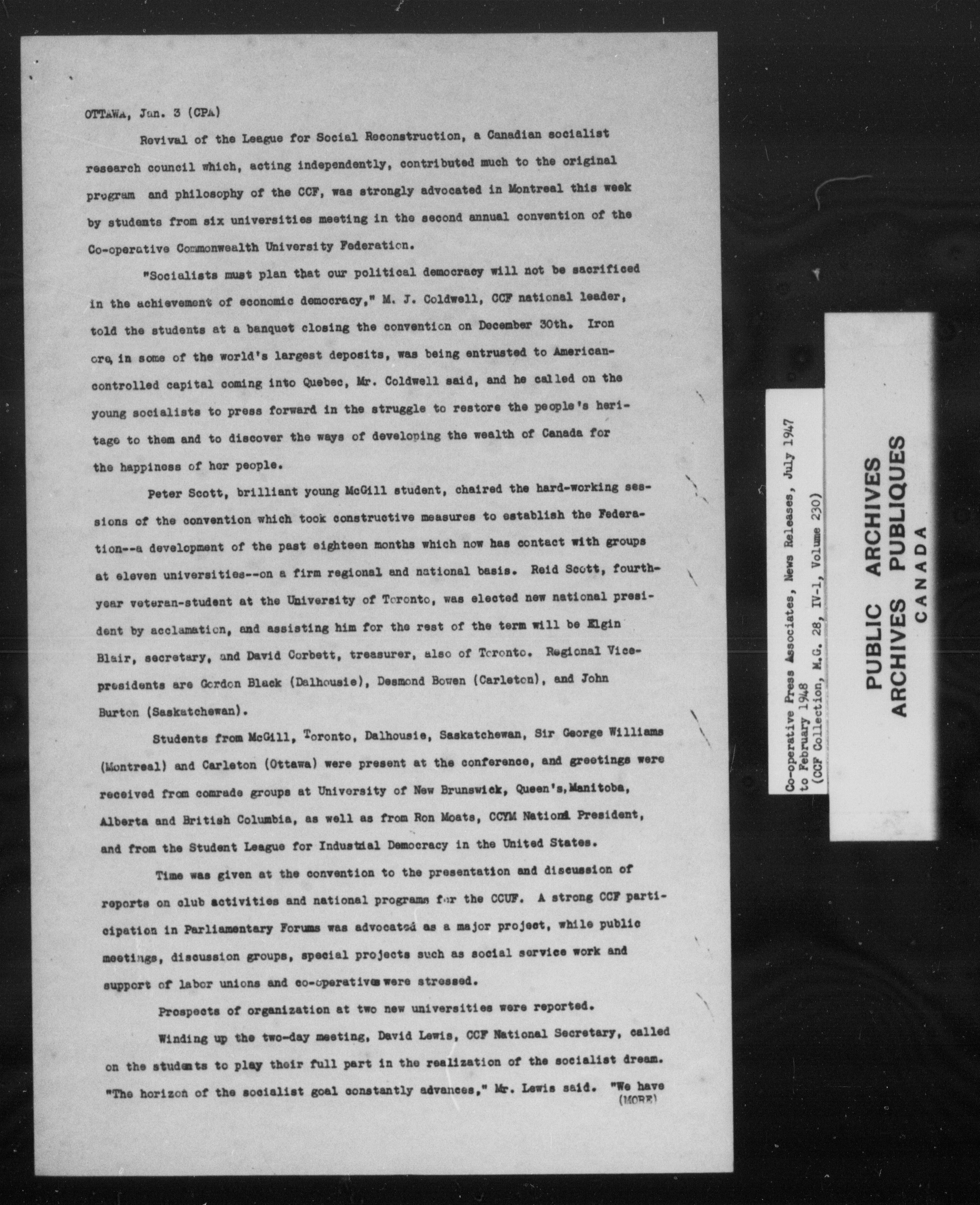 Co-operative Commonwealth Federation (MG 28, IV I) Co-operative Press associates News Releases (1944-1960) - 7023