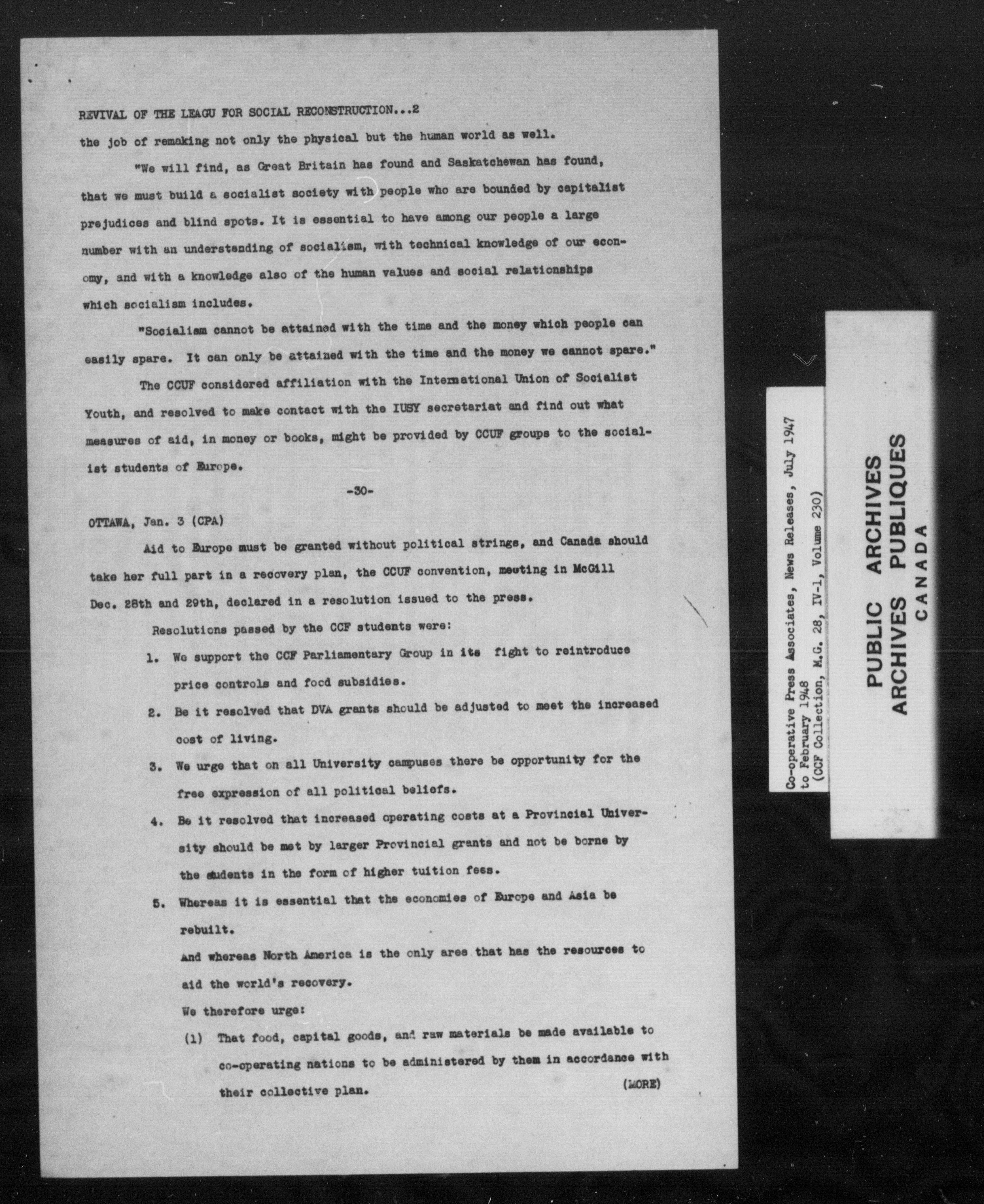 Co-operative Commonwealth Federation (MG 28, IV I) Co-operative Press associates News Releases (1944-1960) - 7023