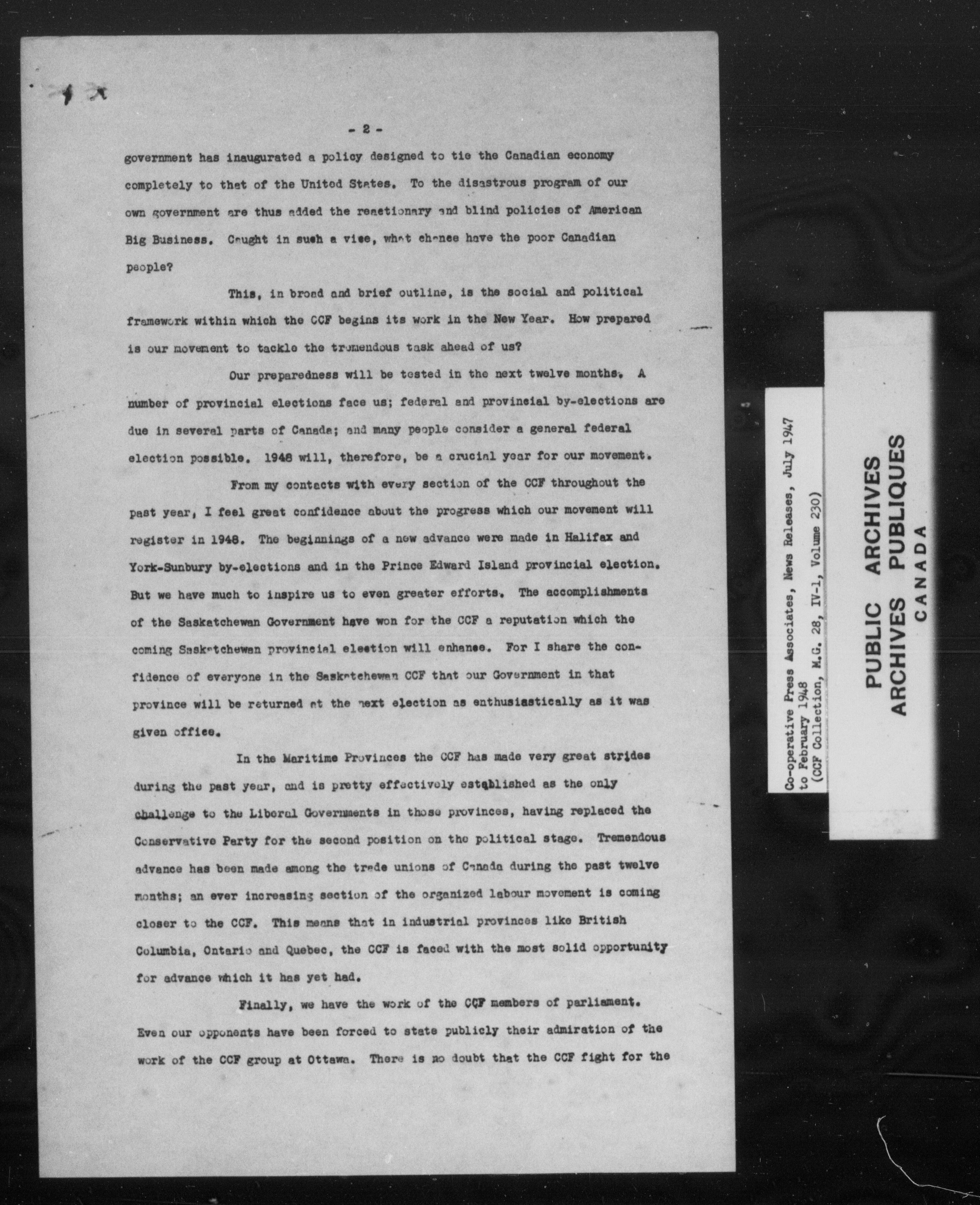 Co-operative Commonwealth Federation (MG 28, IV I) Co-operative Press associates News Releases (1944-1960) - 7023