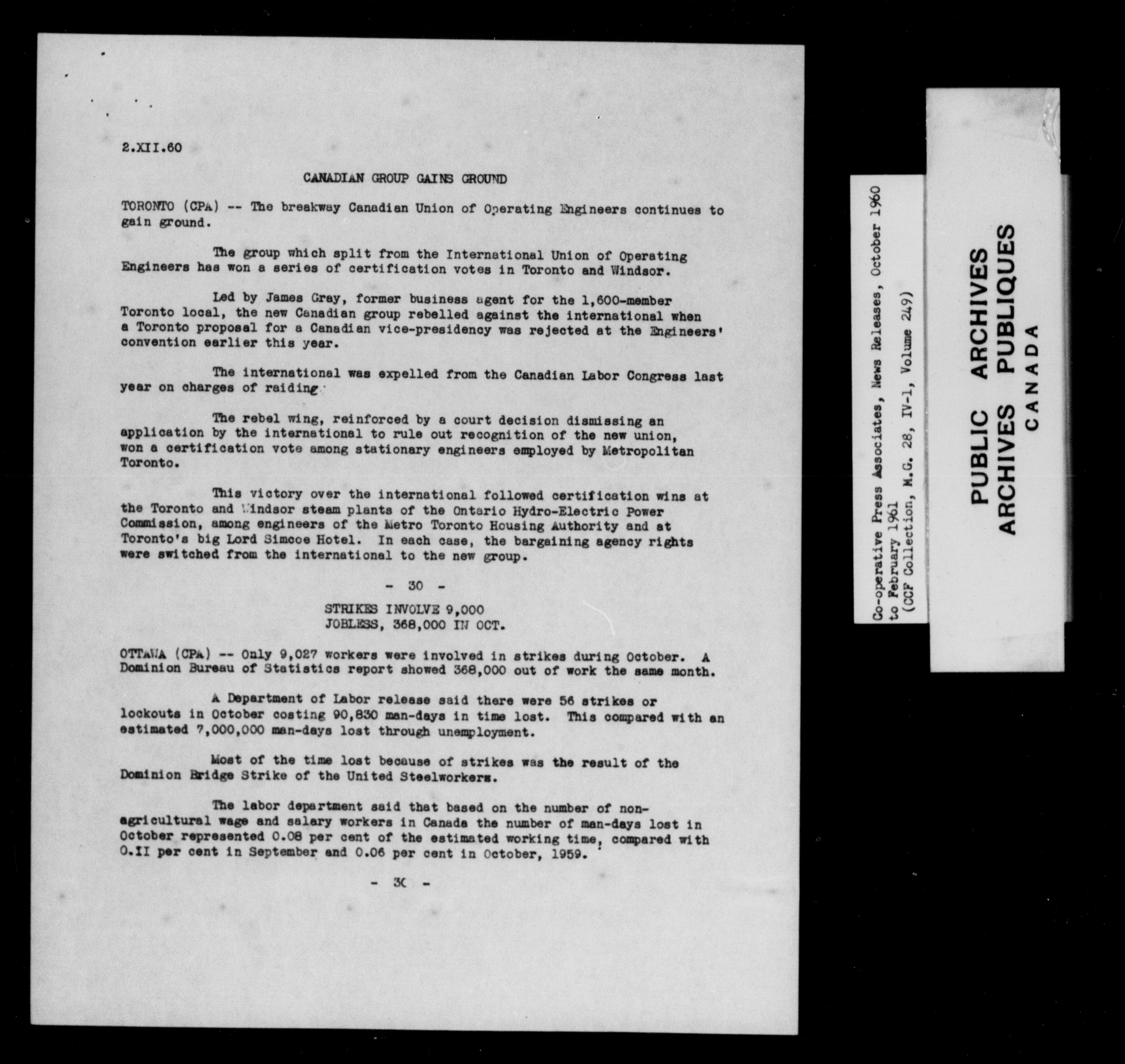 Co-operative Commonwealth Federation (MG 28, IV I) Co-operative Press associates News Releases (1944-1960) - 7028