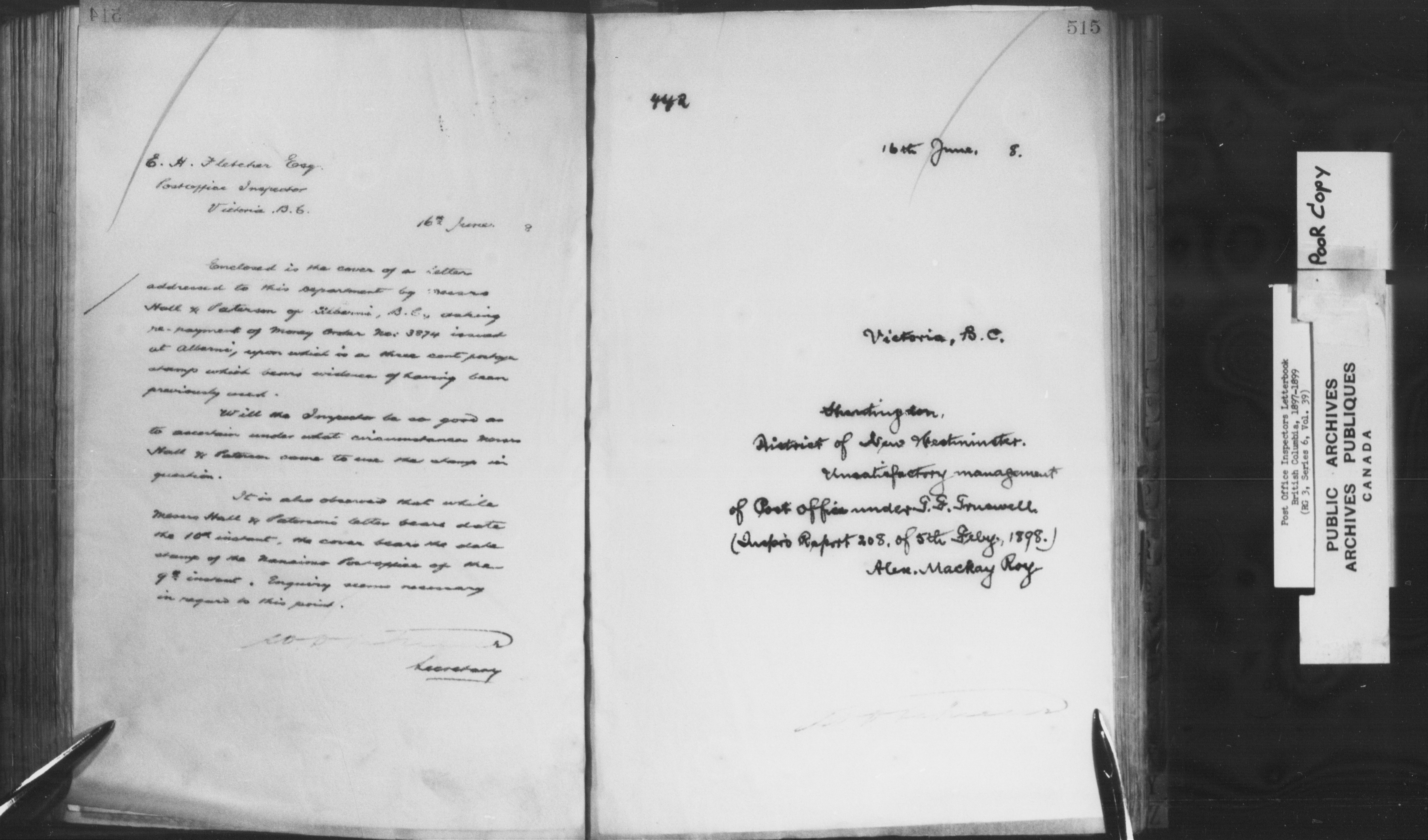 Correspondence from the Secretary to Post Office Inspectors - Letterbooks - British Columbia - 7236