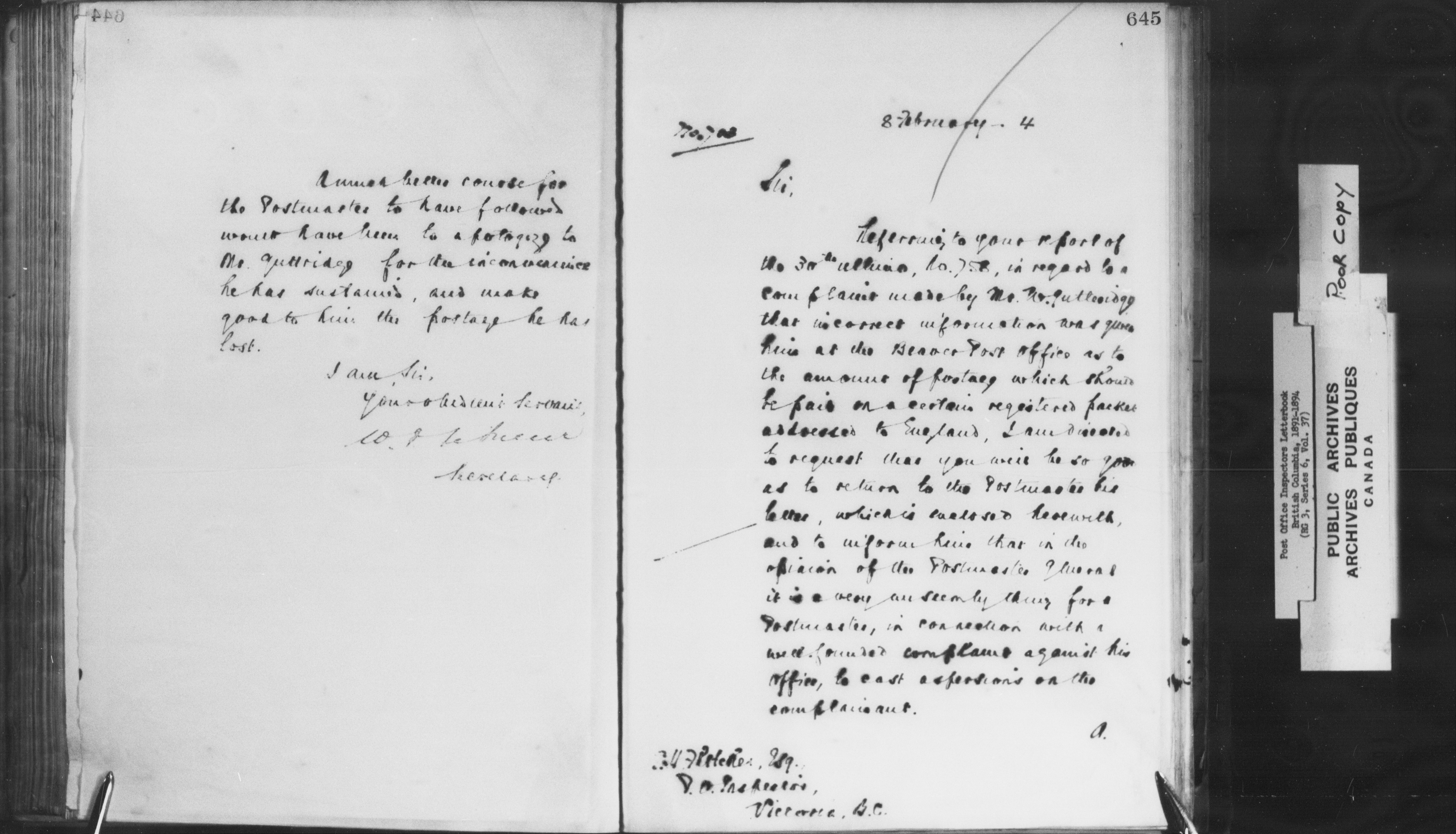 Correspondence from the Secretary to Post Office Inspectors - Letterbooks - British Columbia - 7236