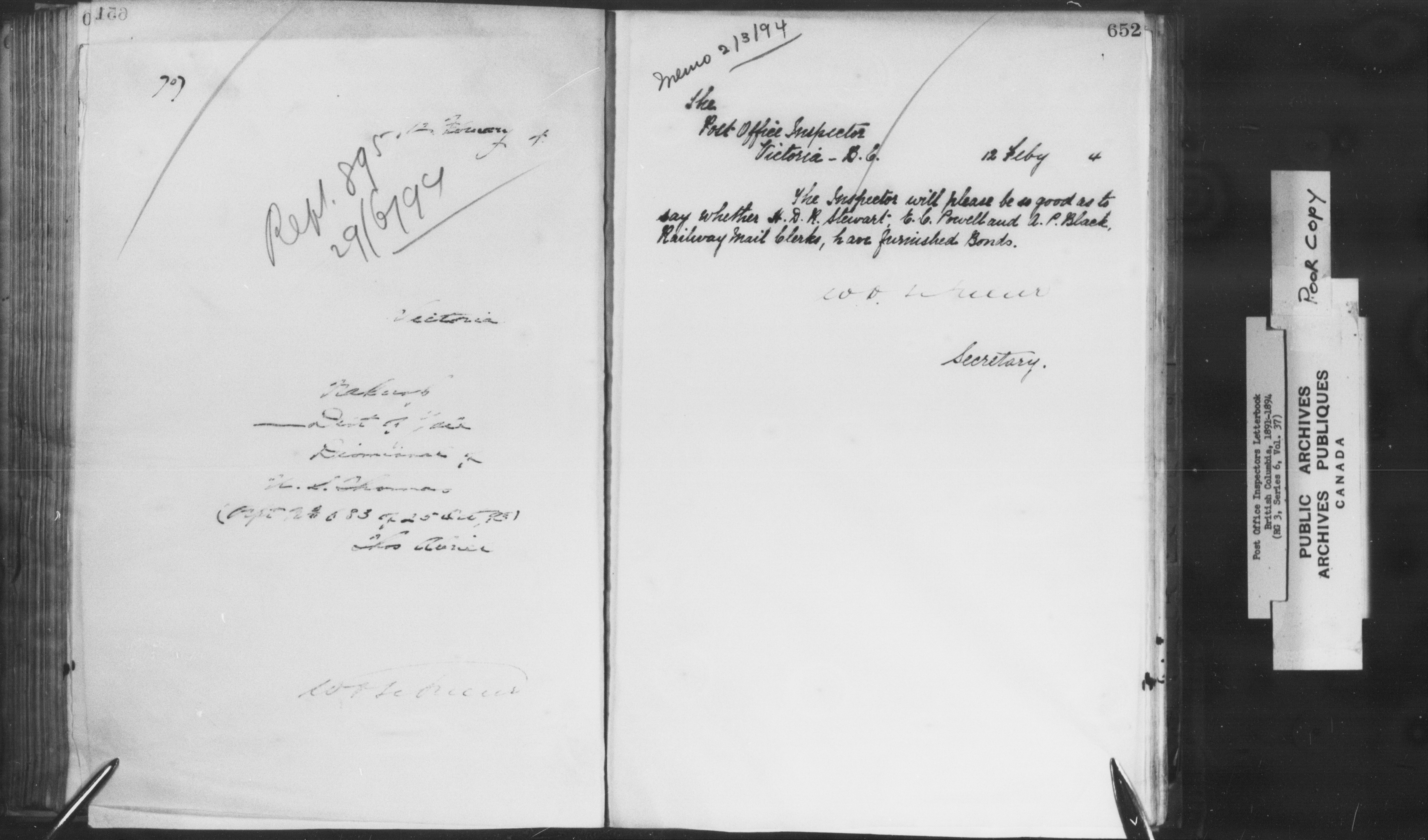 Correspondence from the Secretary to Post Office Inspectors - Letterbooks - British Columbia - 7236
