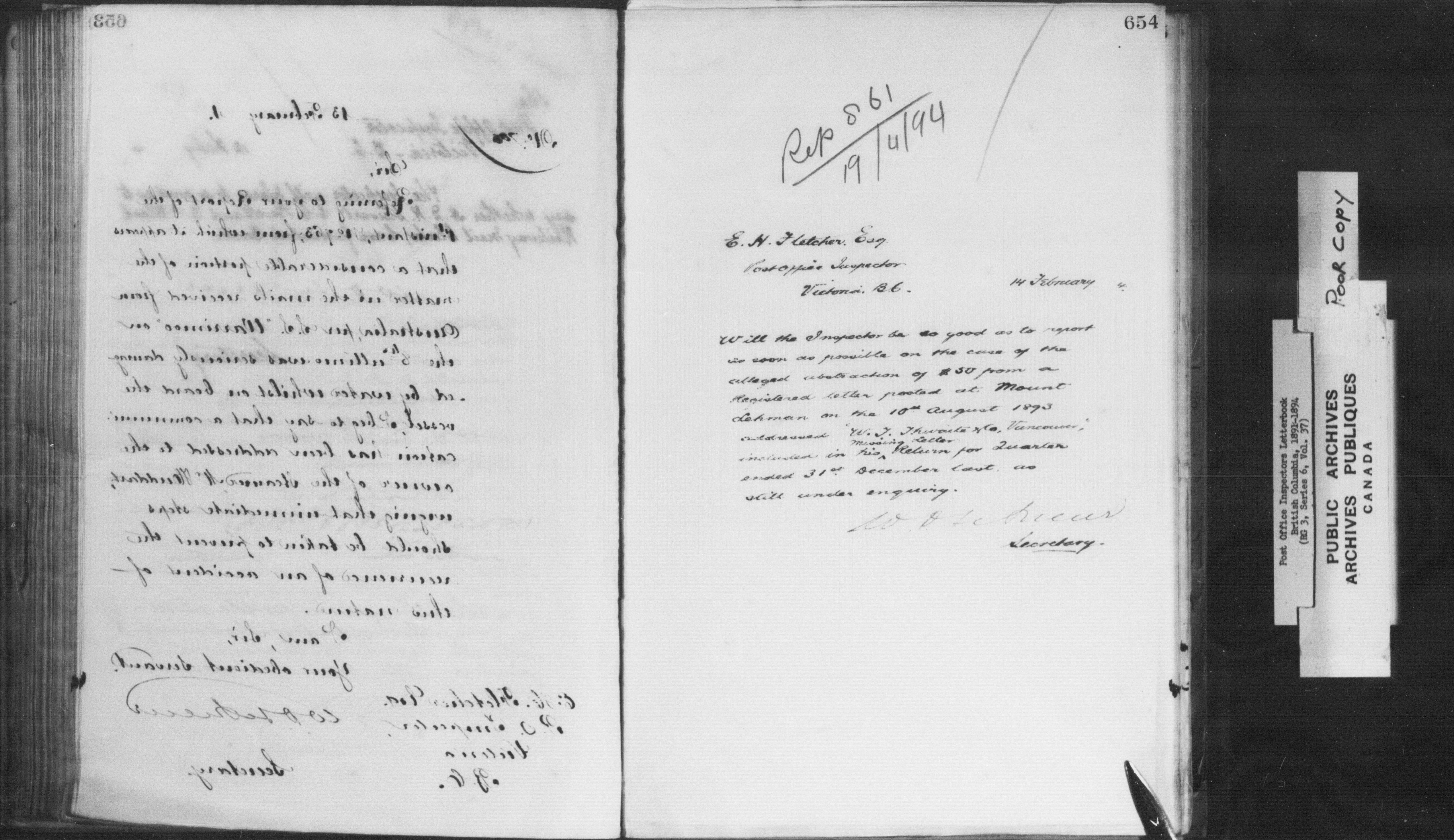 Correspondence from the Secretary to Post Office Inspectors - Letterbooks - British Columbia - 7236