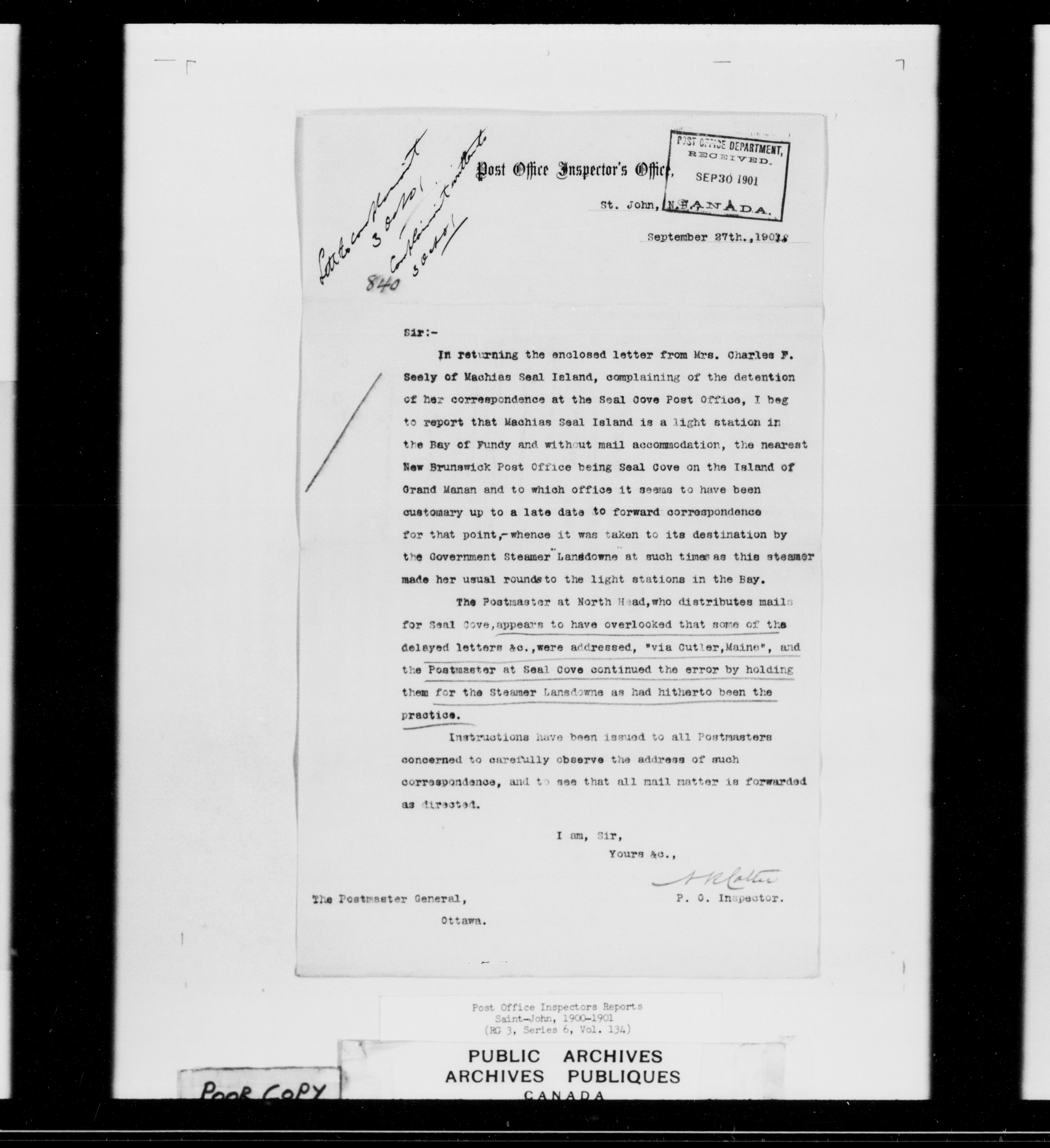 Correspondence from the Secretary to Post Office Inspectors Letterbooks, Saint John - 7244