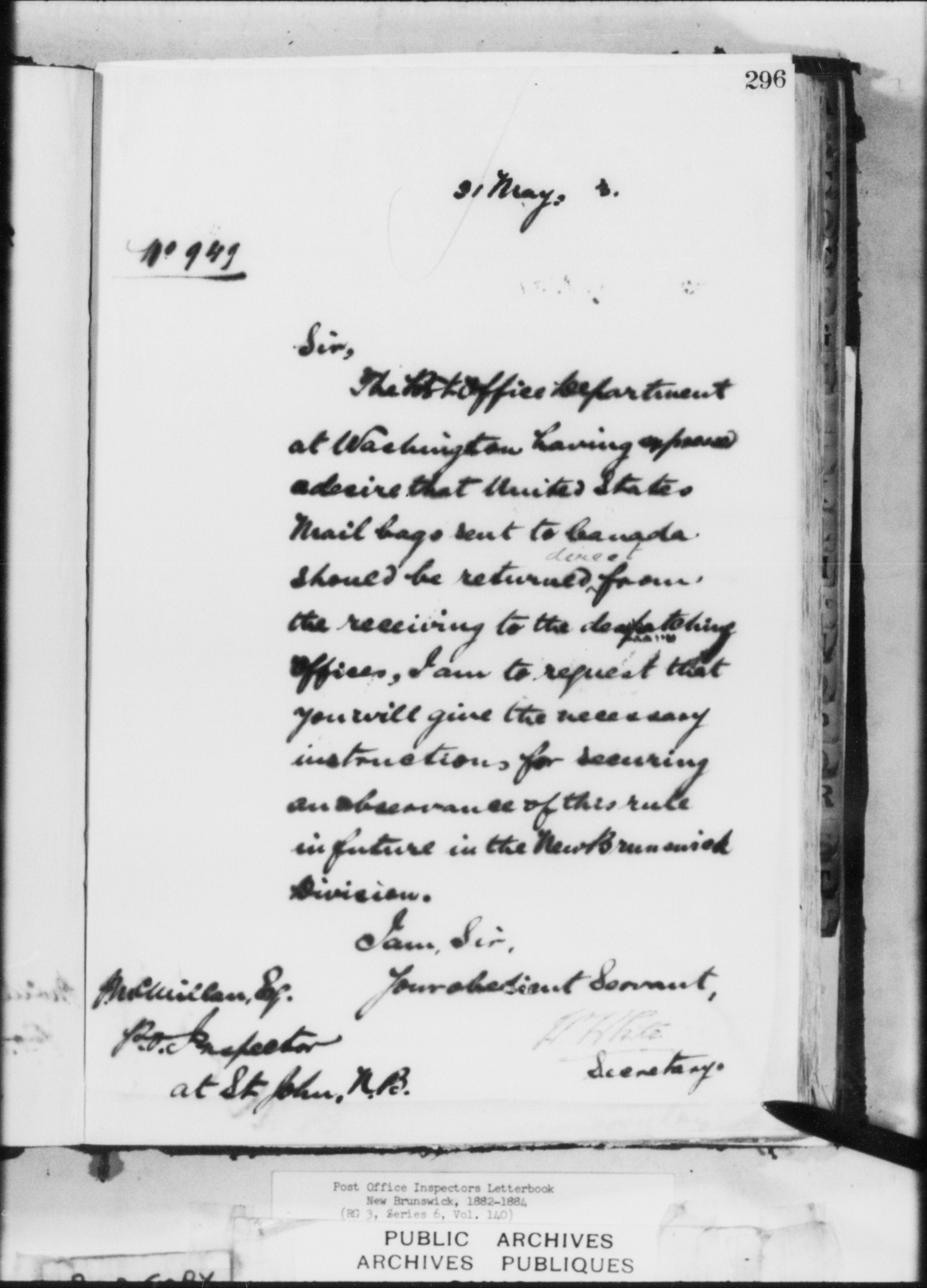 Correspondence from the Secretary to Post Office Inspectors Letterbooks, Saint John - 7245