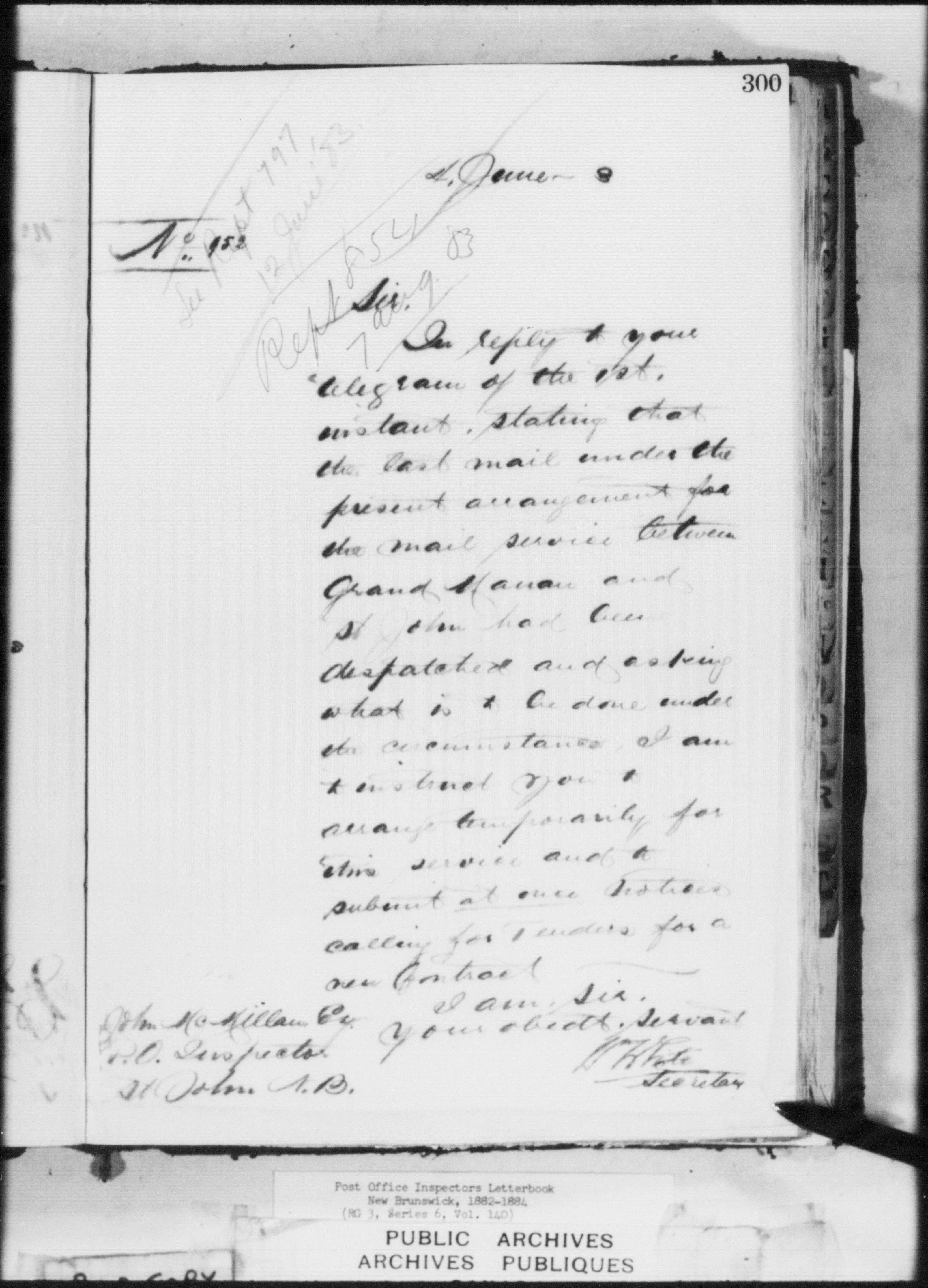 Correspondence from the Secretary to Post Office Inspectors Letterbooks, Saint John - 7245