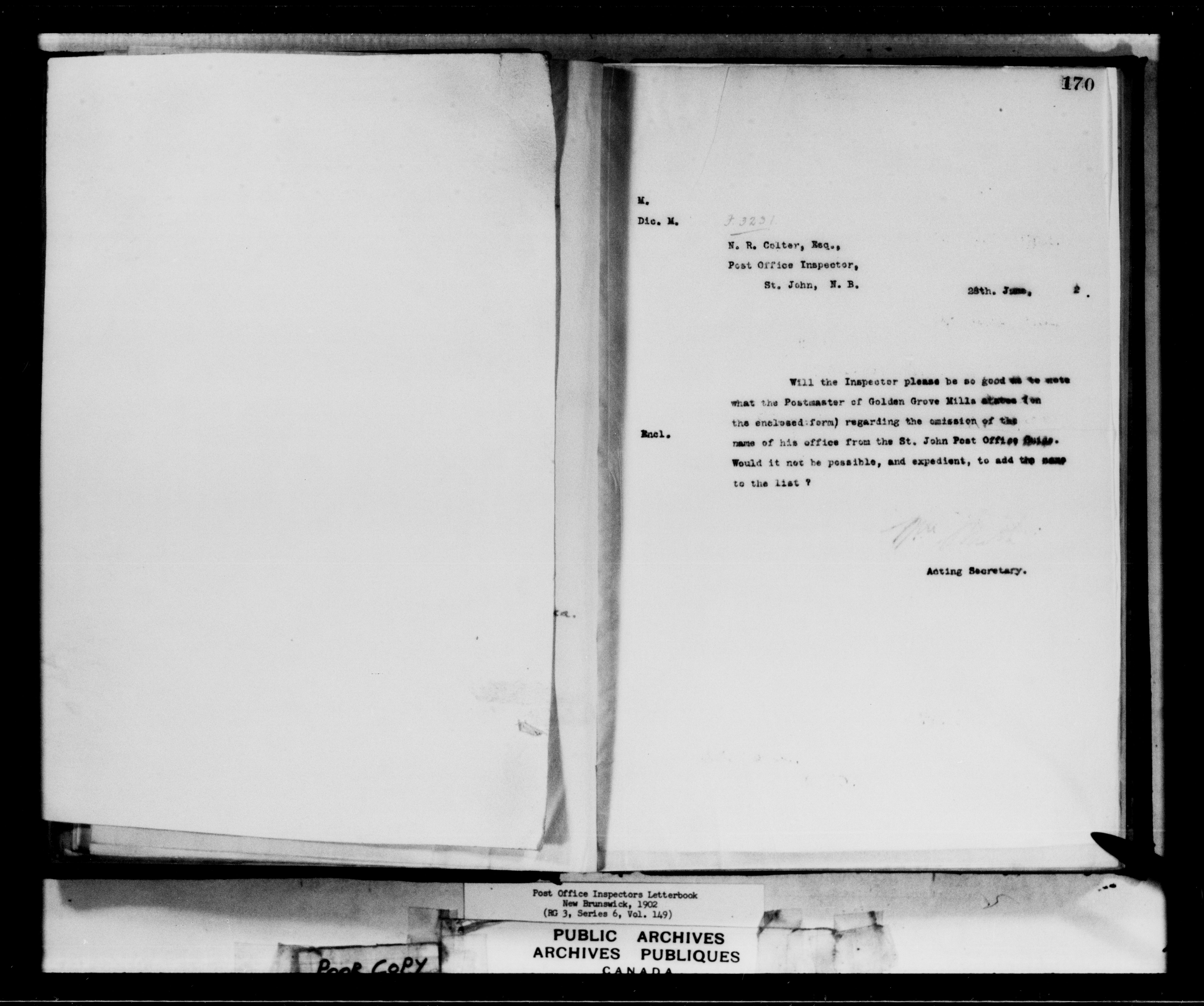 Correspondence from the Secretary to Post Office Inspectors Letterbooks, Saint John - 7250
