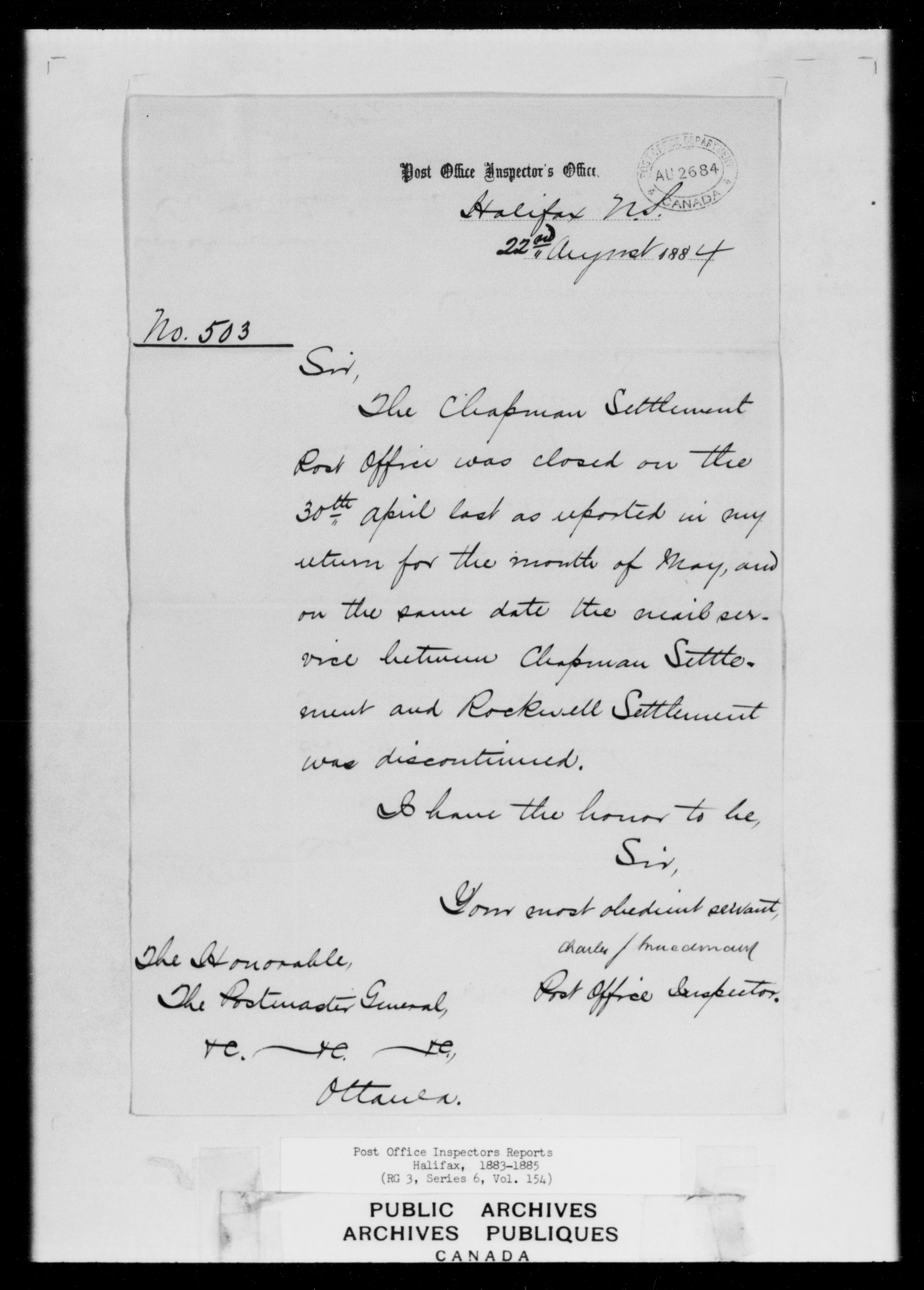 Post Office Inspectors Reports - Halifax and Charlottetown - 7251