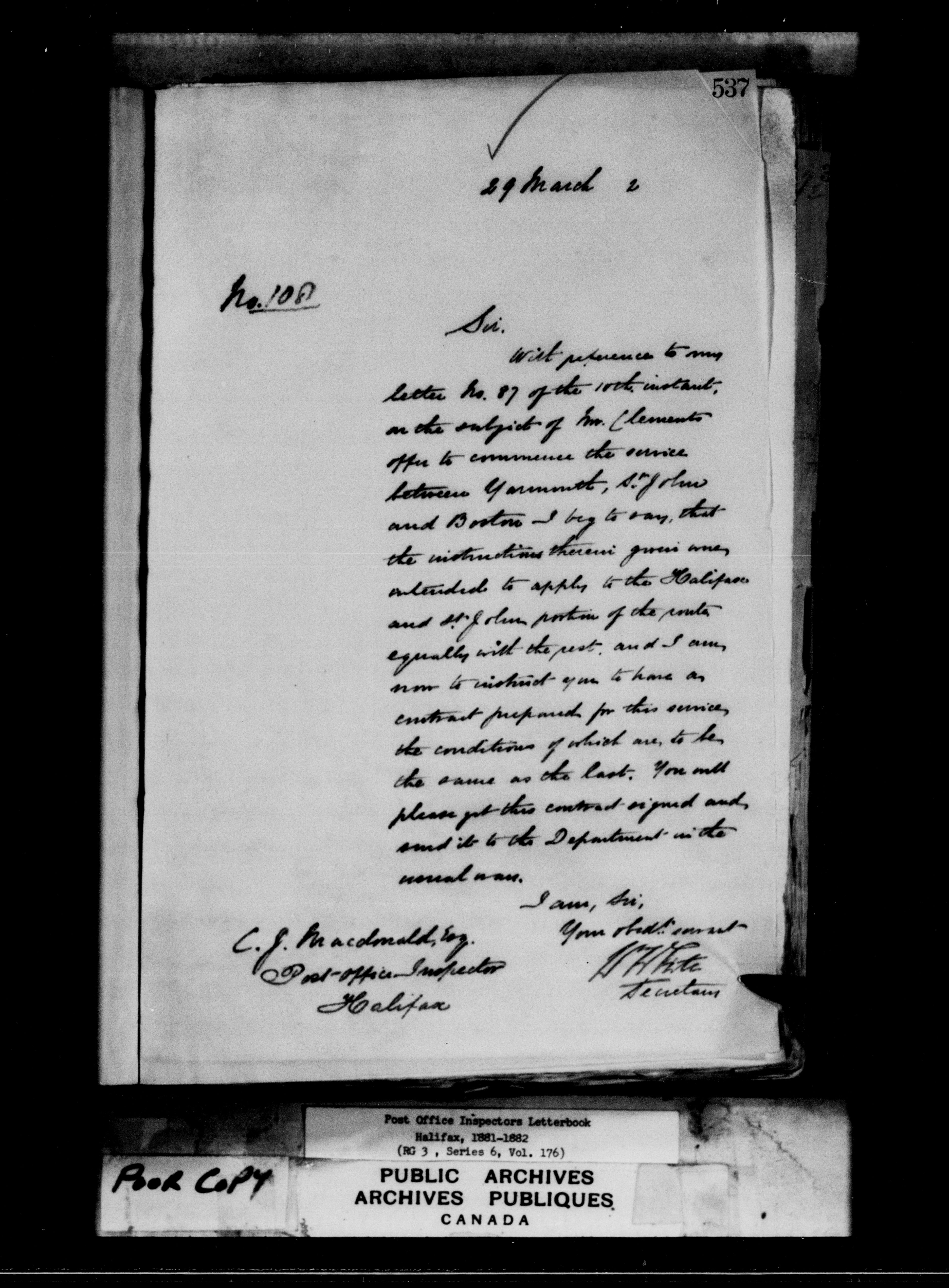 Correspondence from the Secretary to Post Office Inspectors : Letterbooks, Halifax - 7259