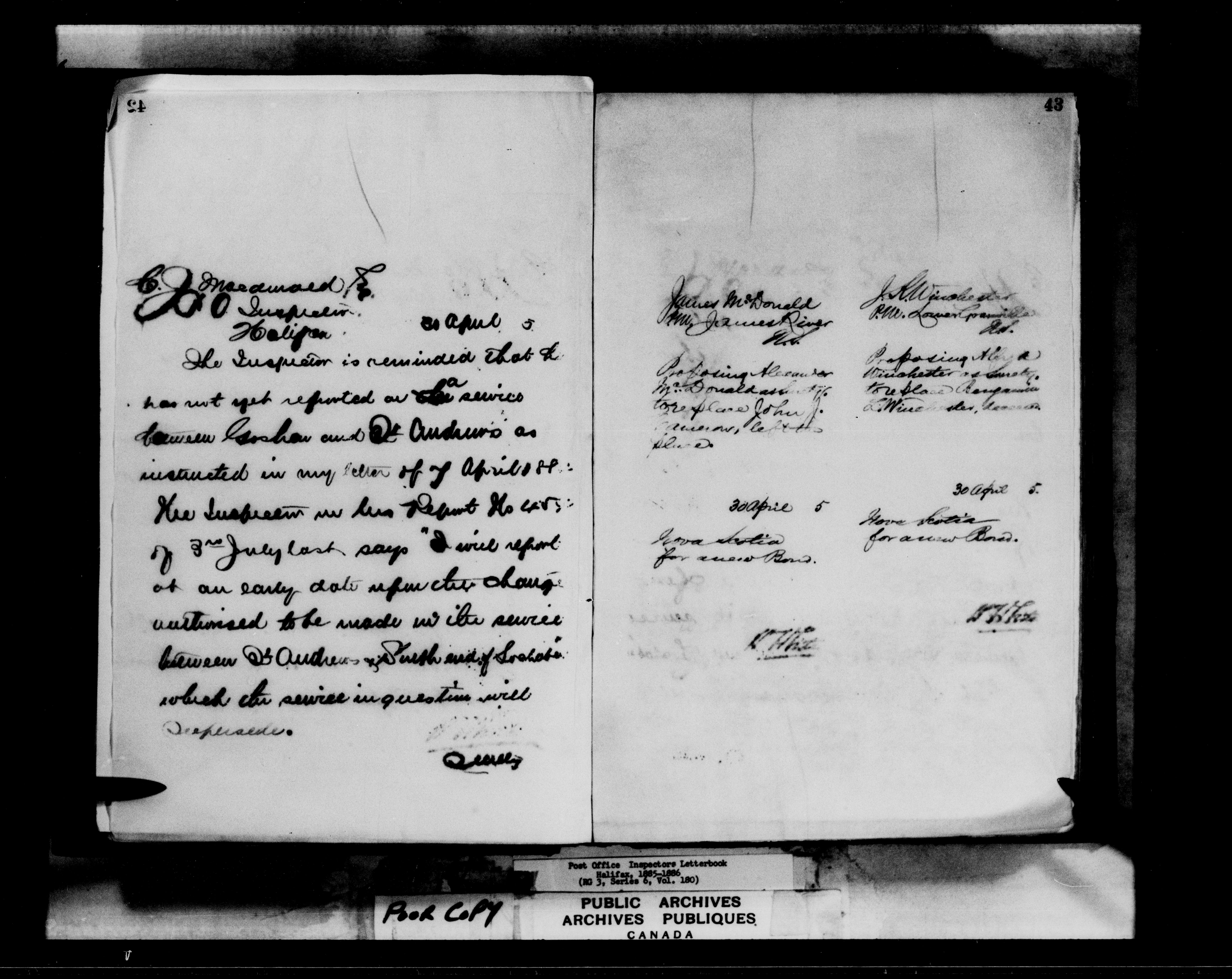 Correspondence from the Secretary to Post Office Inspectors : Letterbooks, Halifax - 7260