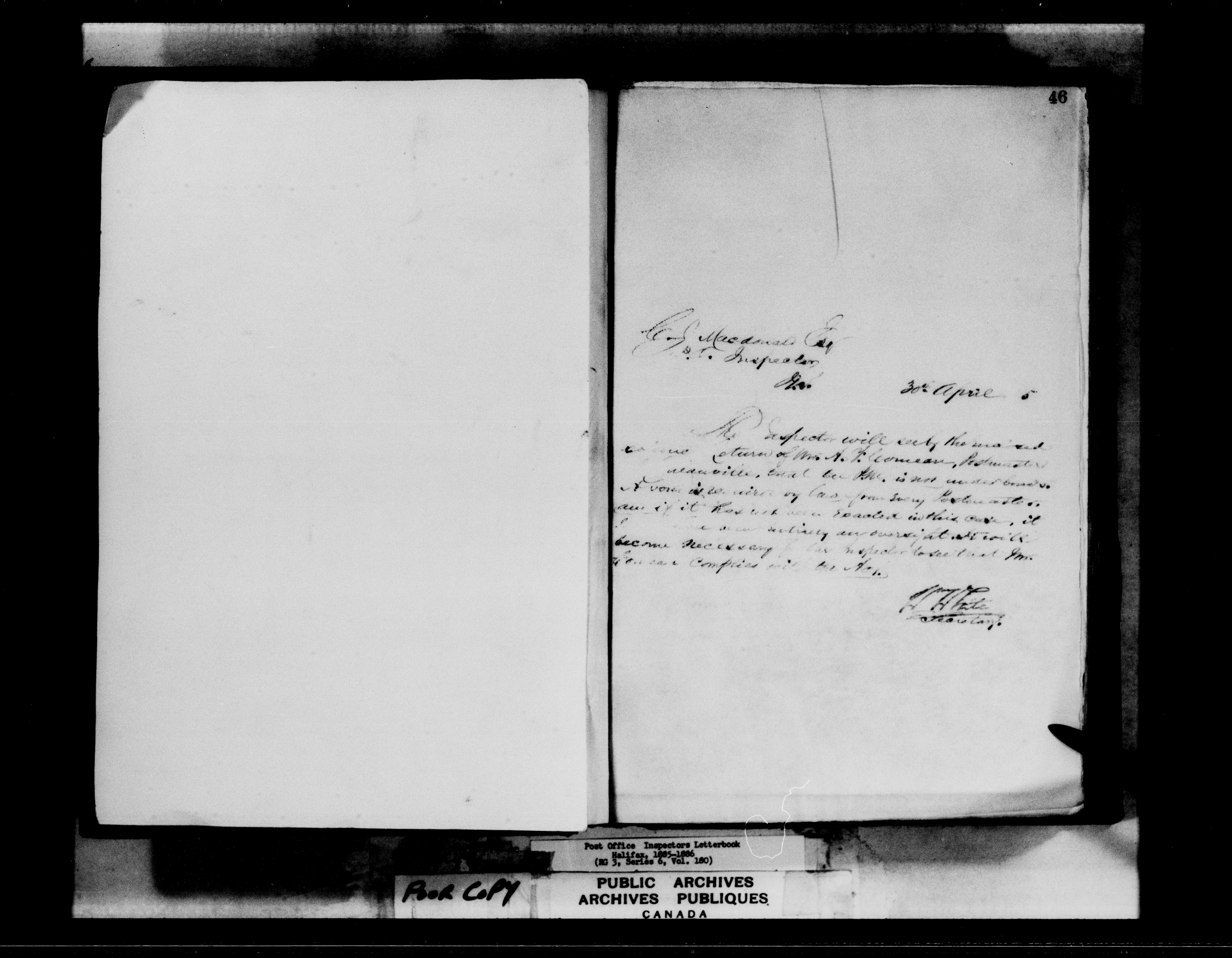 Correspondence from the Secretary to Post Office Inspectors : Letterbooks, Halifax - 7260