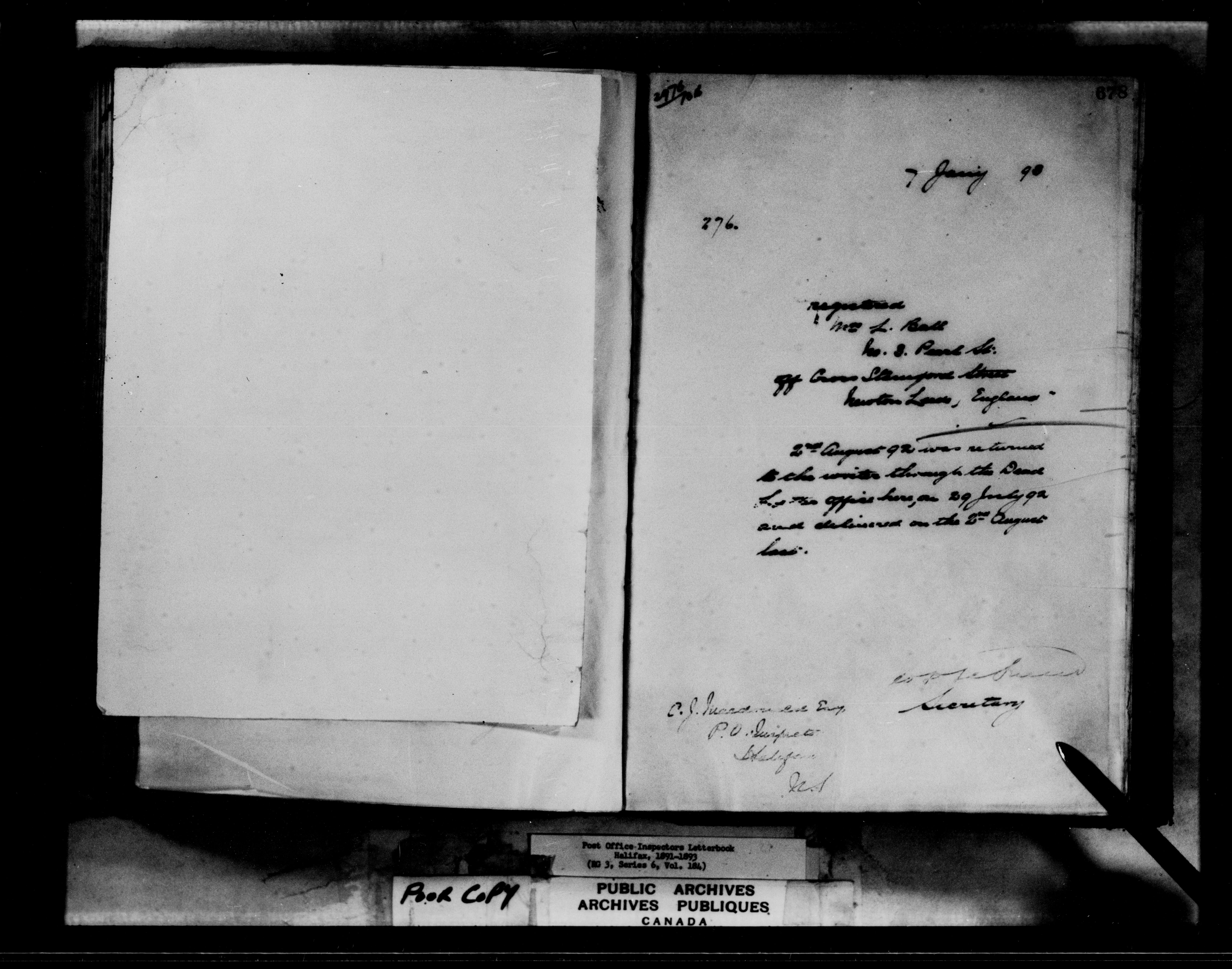 Correspondence from the Secretary to Post Office Inspectors : Letterbooks, Halifax - 7261