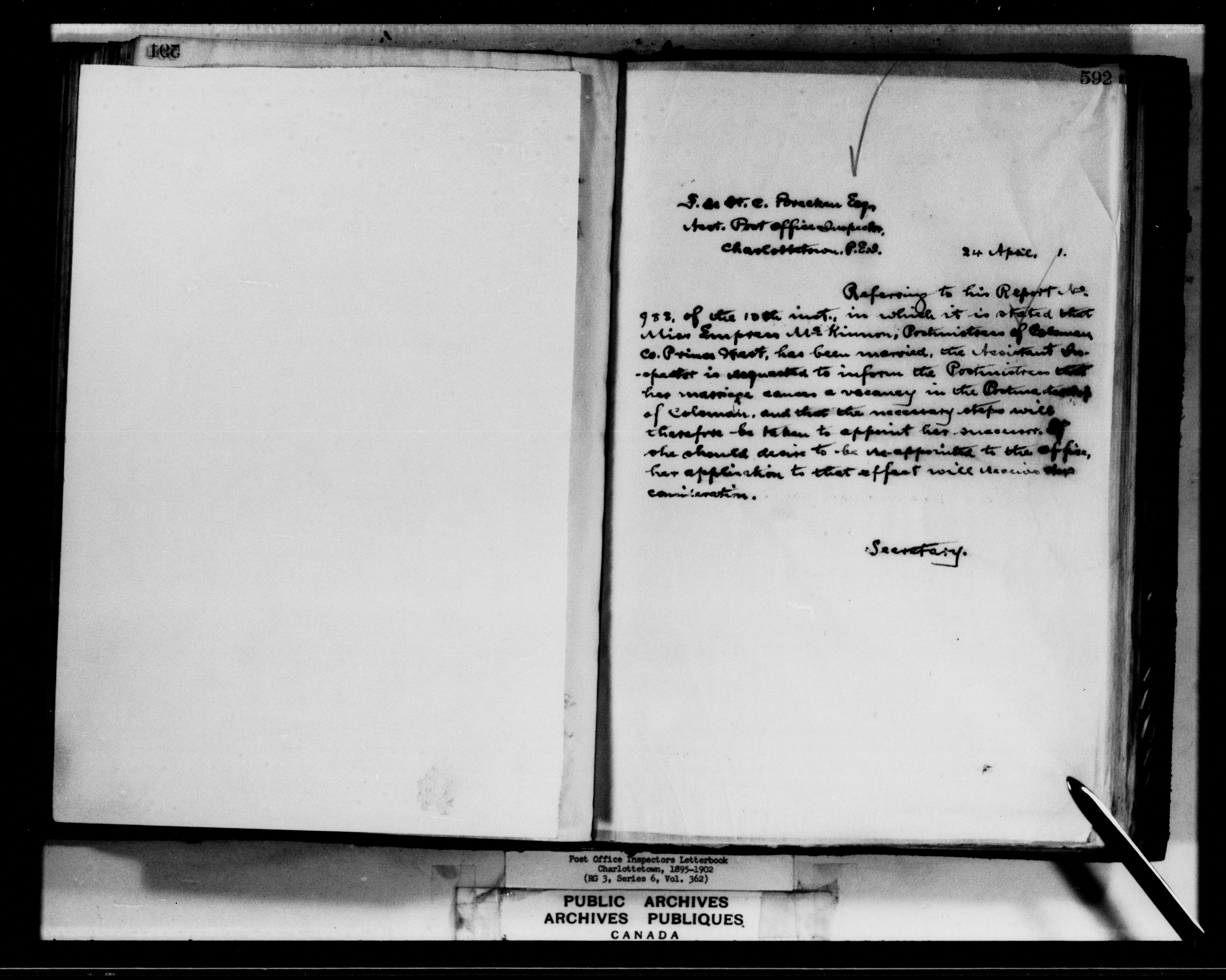 Correspondence from the Secretary to Post Office Inspectors : Letterbooks, Prince Edward Island, Charlottetown - 7266