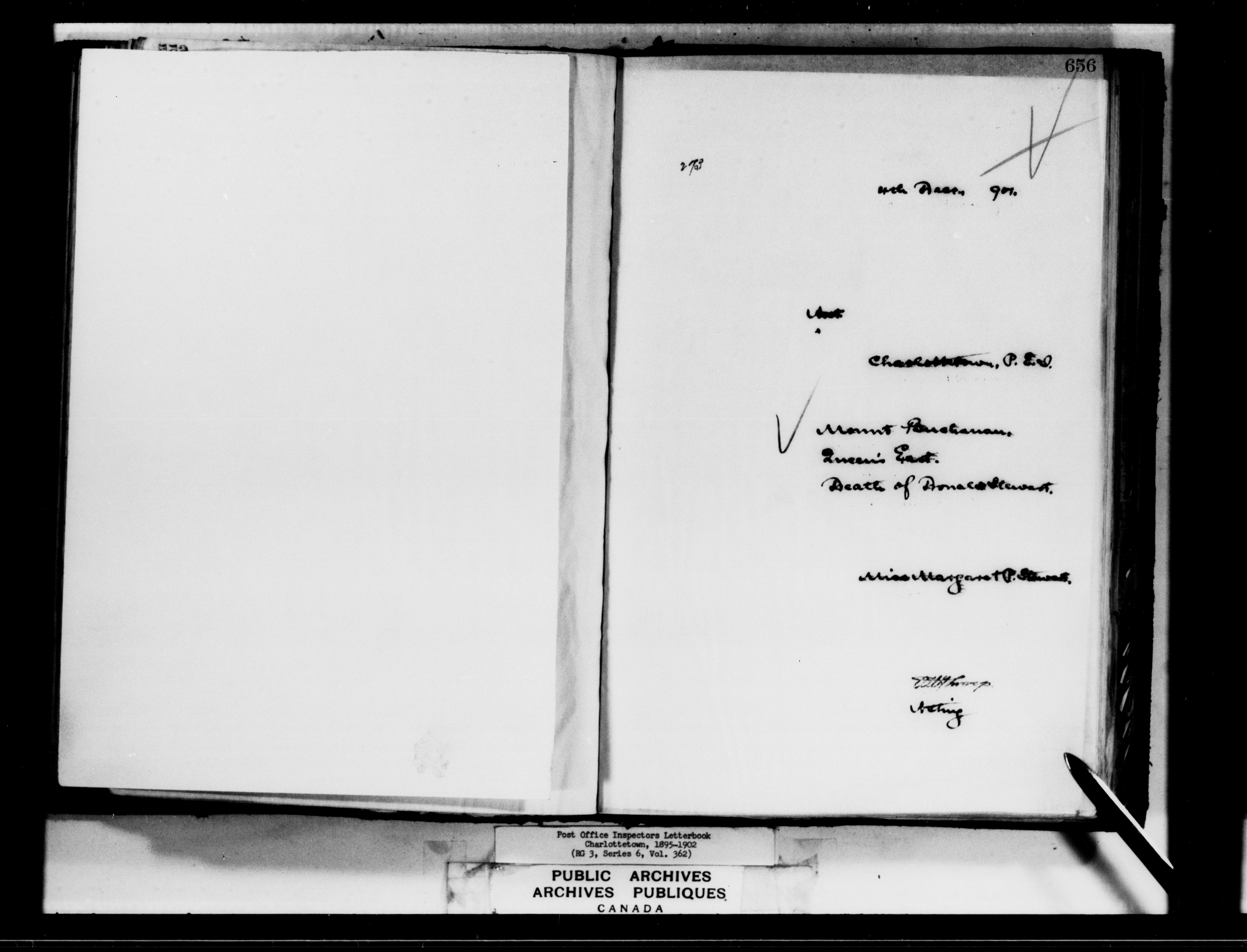Correspondence from the Secretary to Post Office Inspectors : Letterbooks, Prince Edward Island, Charlottetown - 7266