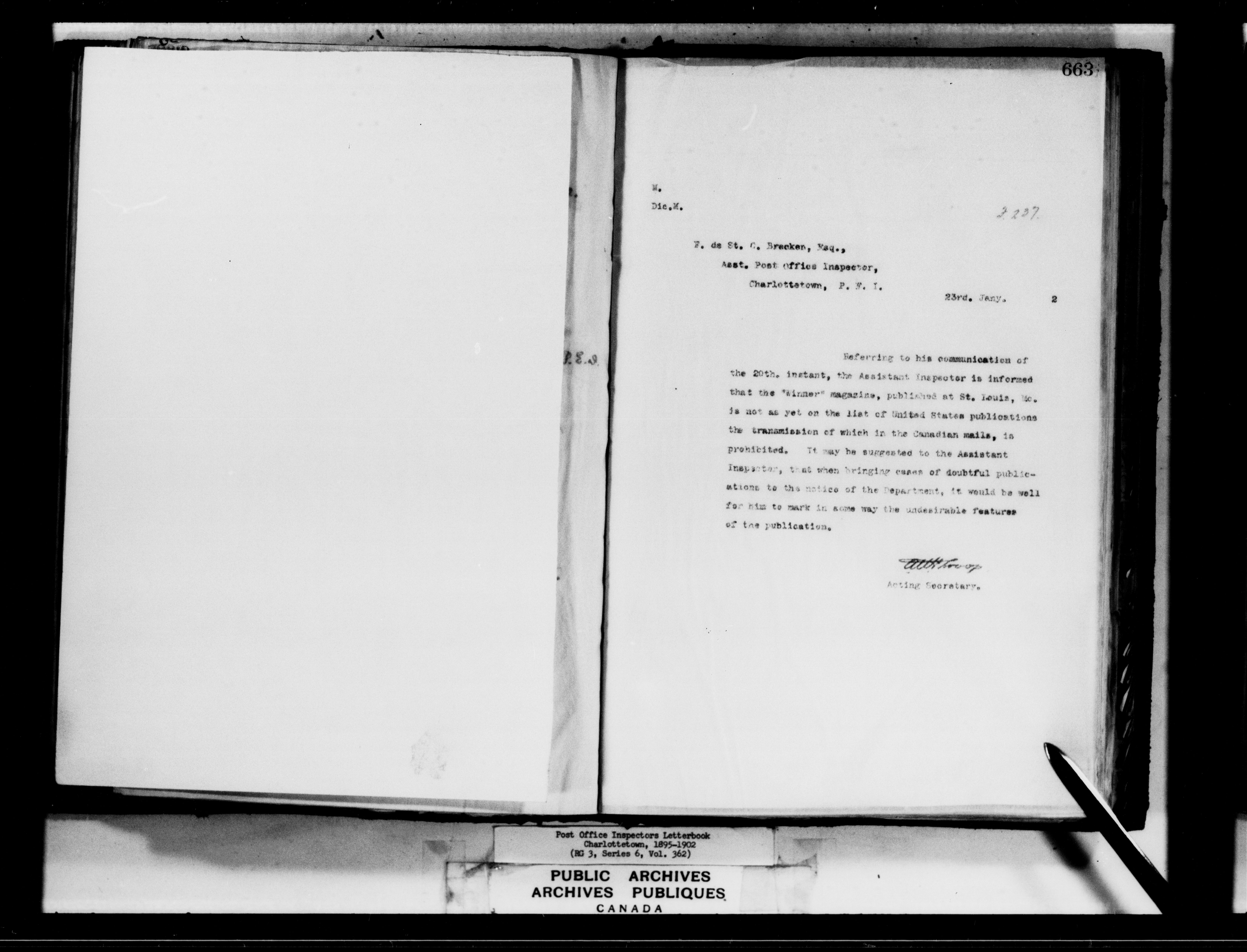 Correspondence from the Secretary to Post Office Inspectors : Letterbooks, Prince Edward Island, Charlottetown - 7266