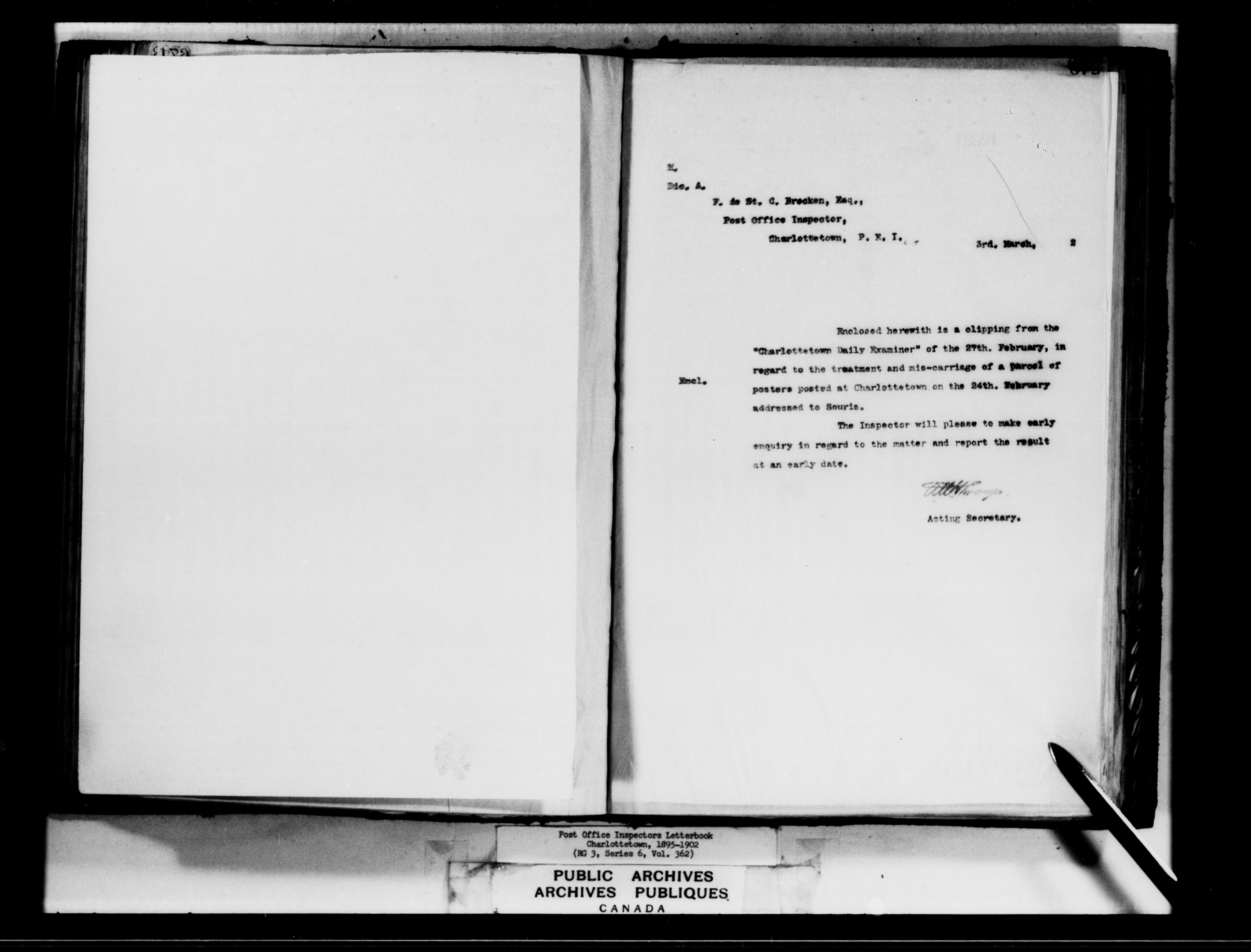 Correspondence from the Secretary to Post Office Inspectors : Letterbooks, Prince Edward Island, Charlottetown - 7266