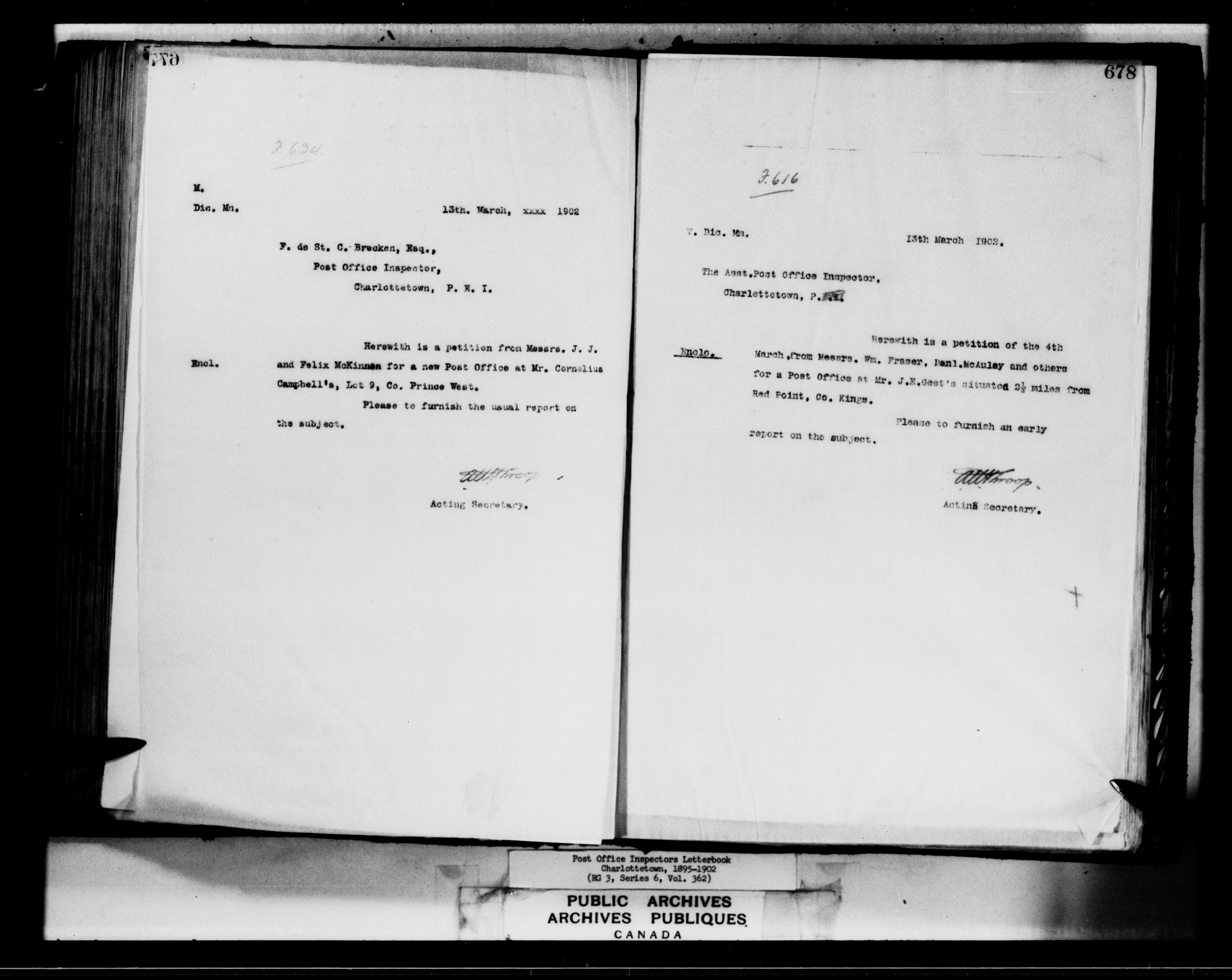 Correspondence from the Secretary to Post Office Inspectors : Letterbooks, Prince Edward Island, Charlottetown - 7266