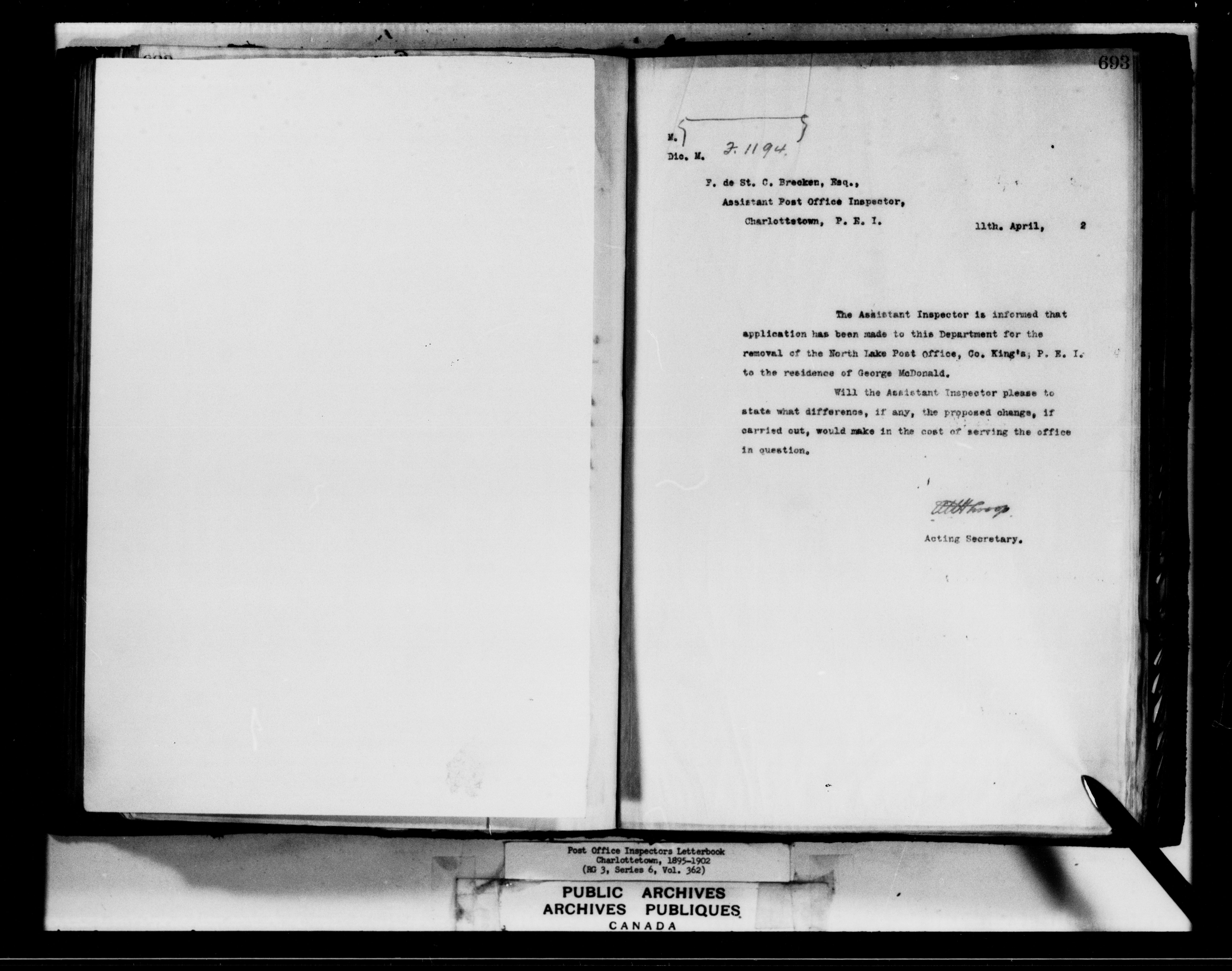 Correspondence from the Secretary to Post Office Inspectors : Letterbooks, Prince Edward Island, Charlottetown - 7266