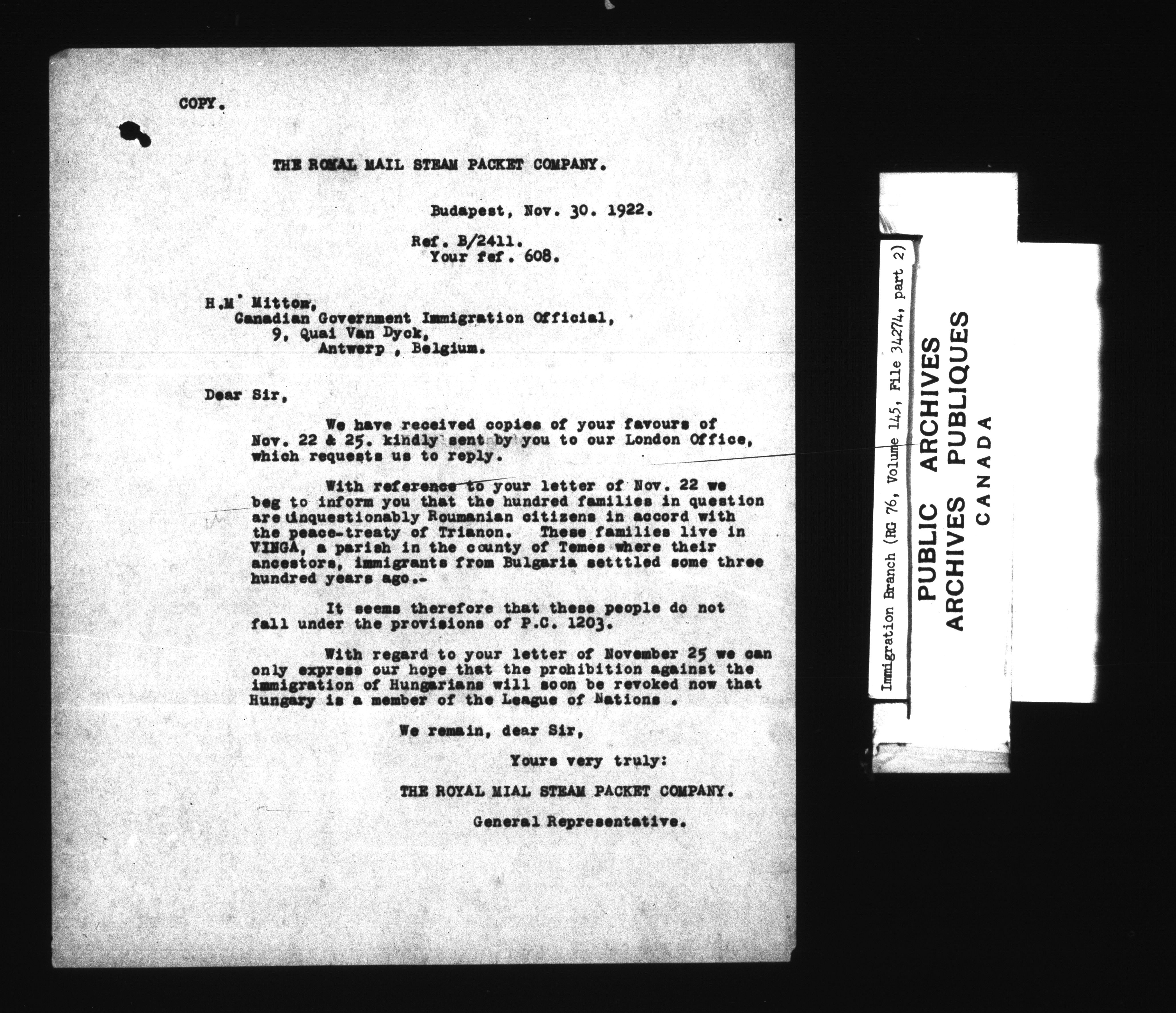 Subject, policy and case files in the First Central Registry series of the Immigration Program, 1892-1950 - 7301