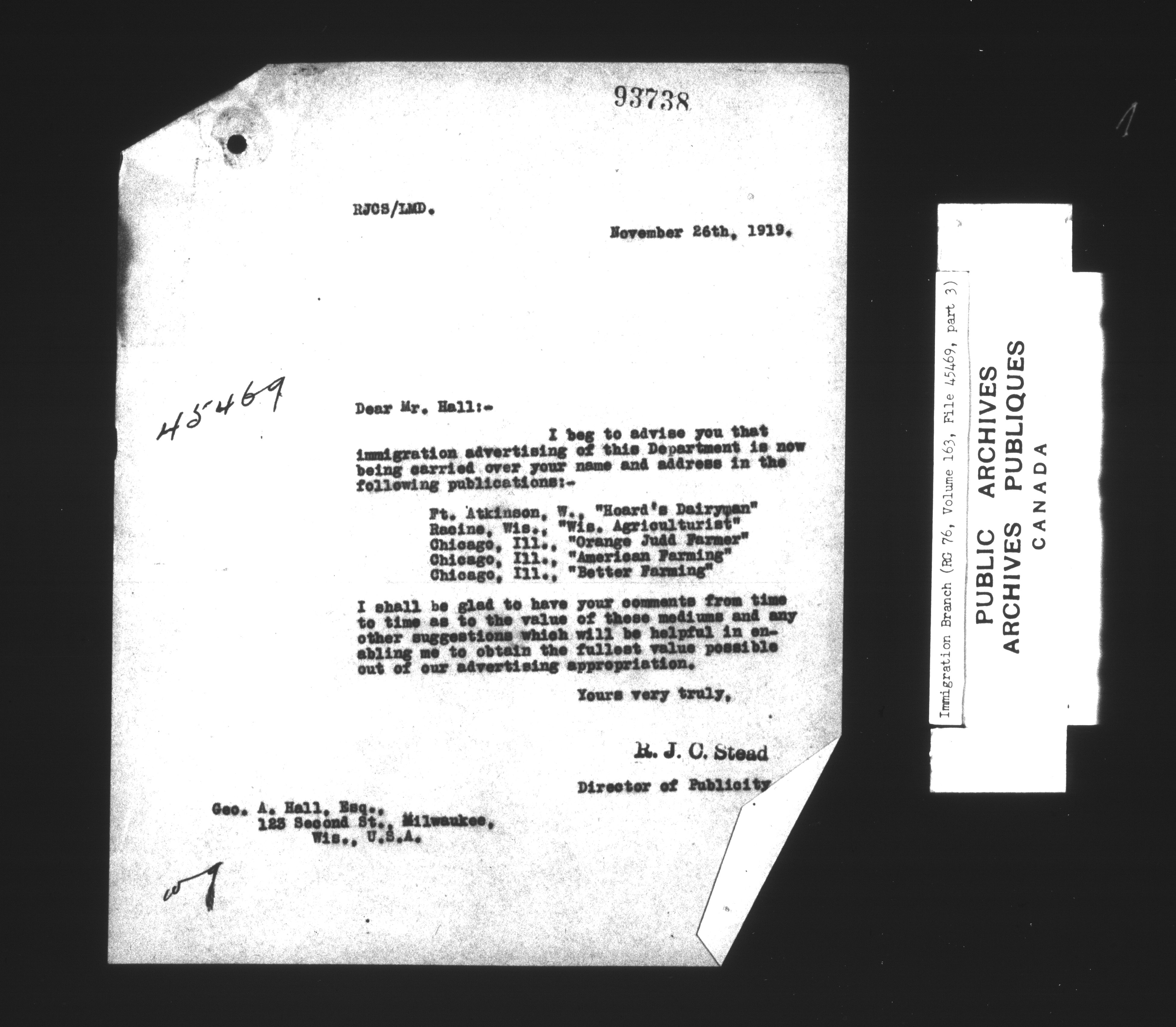 Subject, policy and case files in the First Central Registry series of the Immigration Program, 1892-1950 - 7320