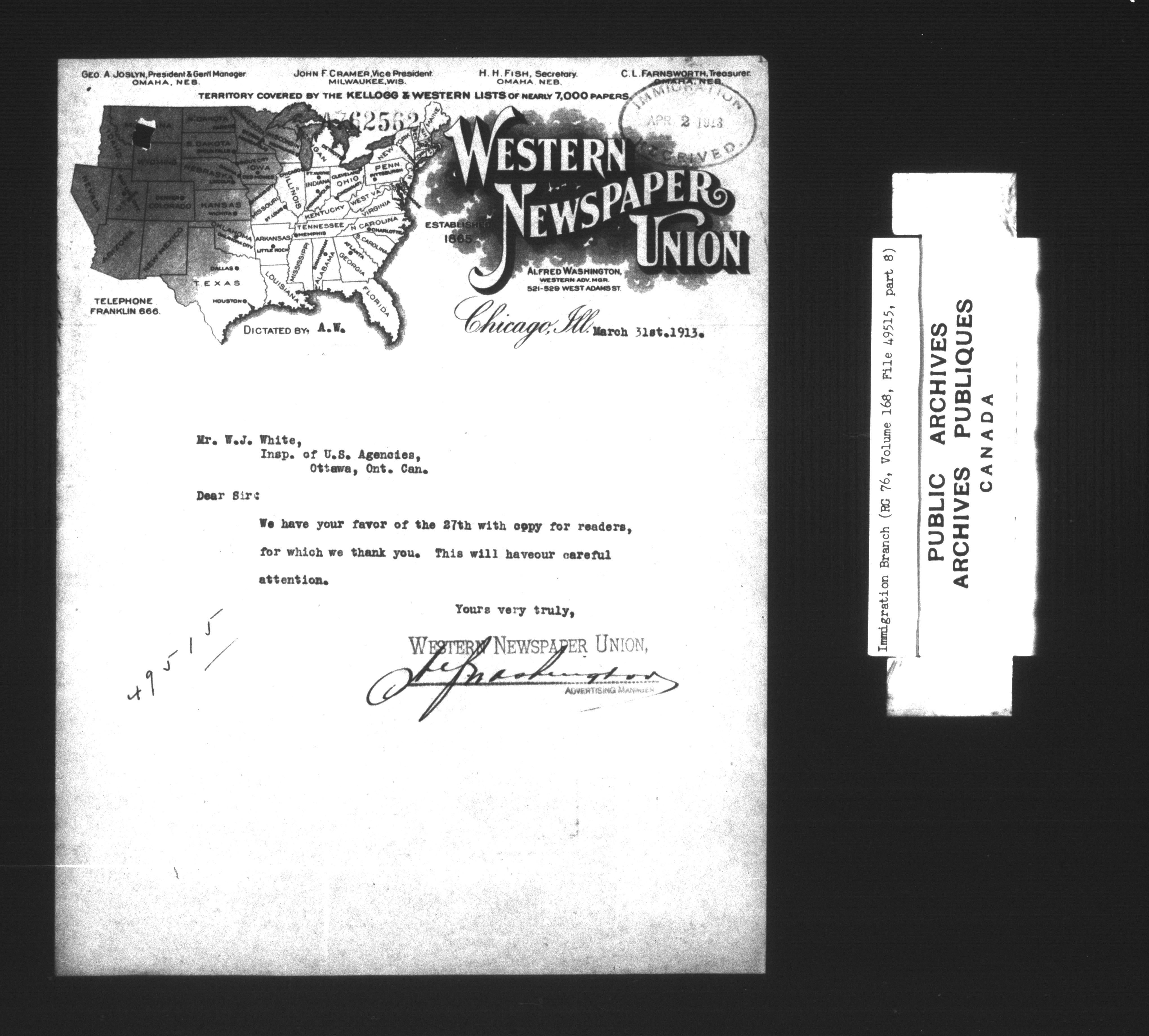 Subject, policy and case files in the First Central Registry series of the Immigration Program, 1892-1950 - 7325