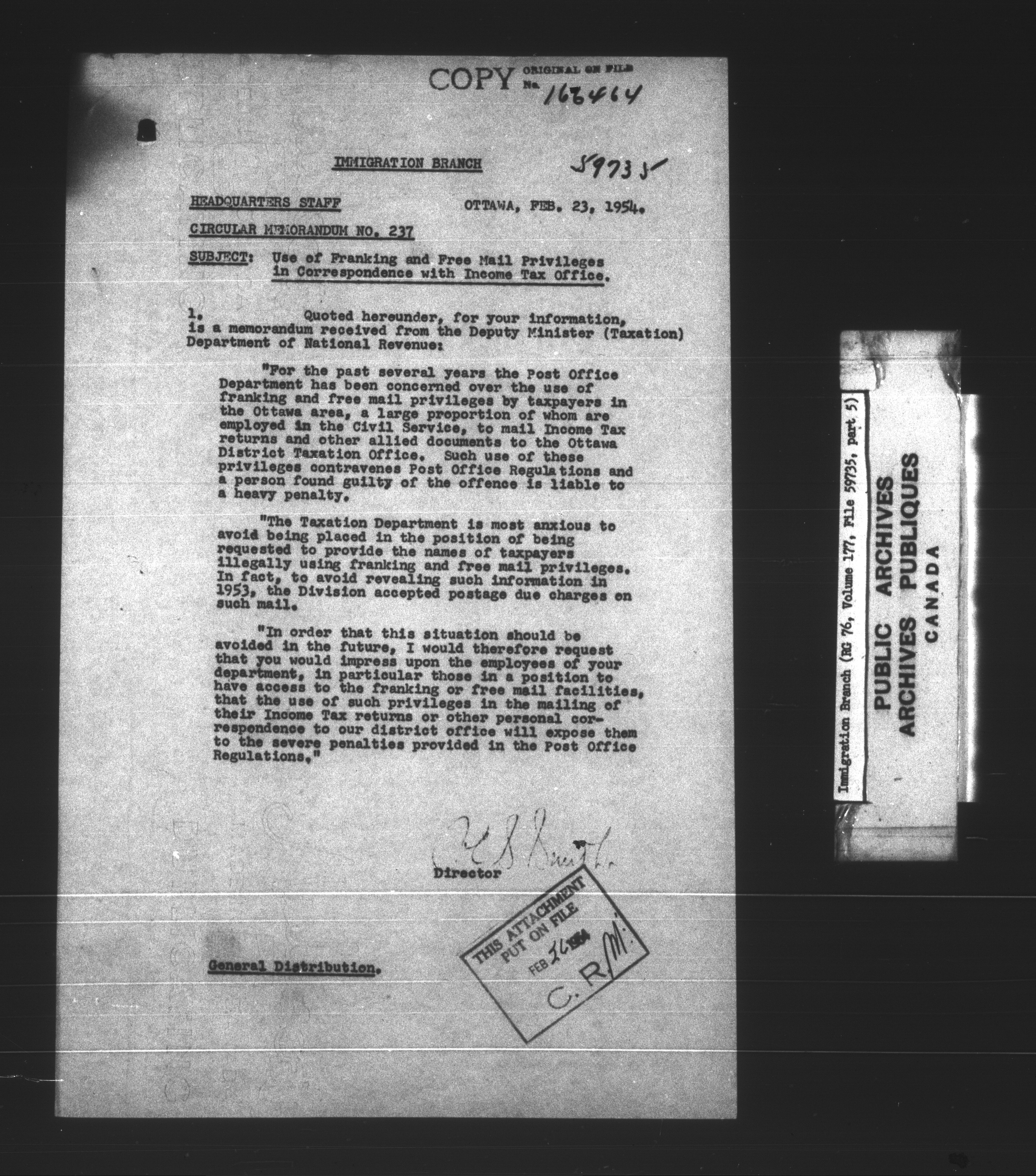 Subject, policy and case files in the First Central Registry series of the Immigration Program, 1892-1950 - 7333