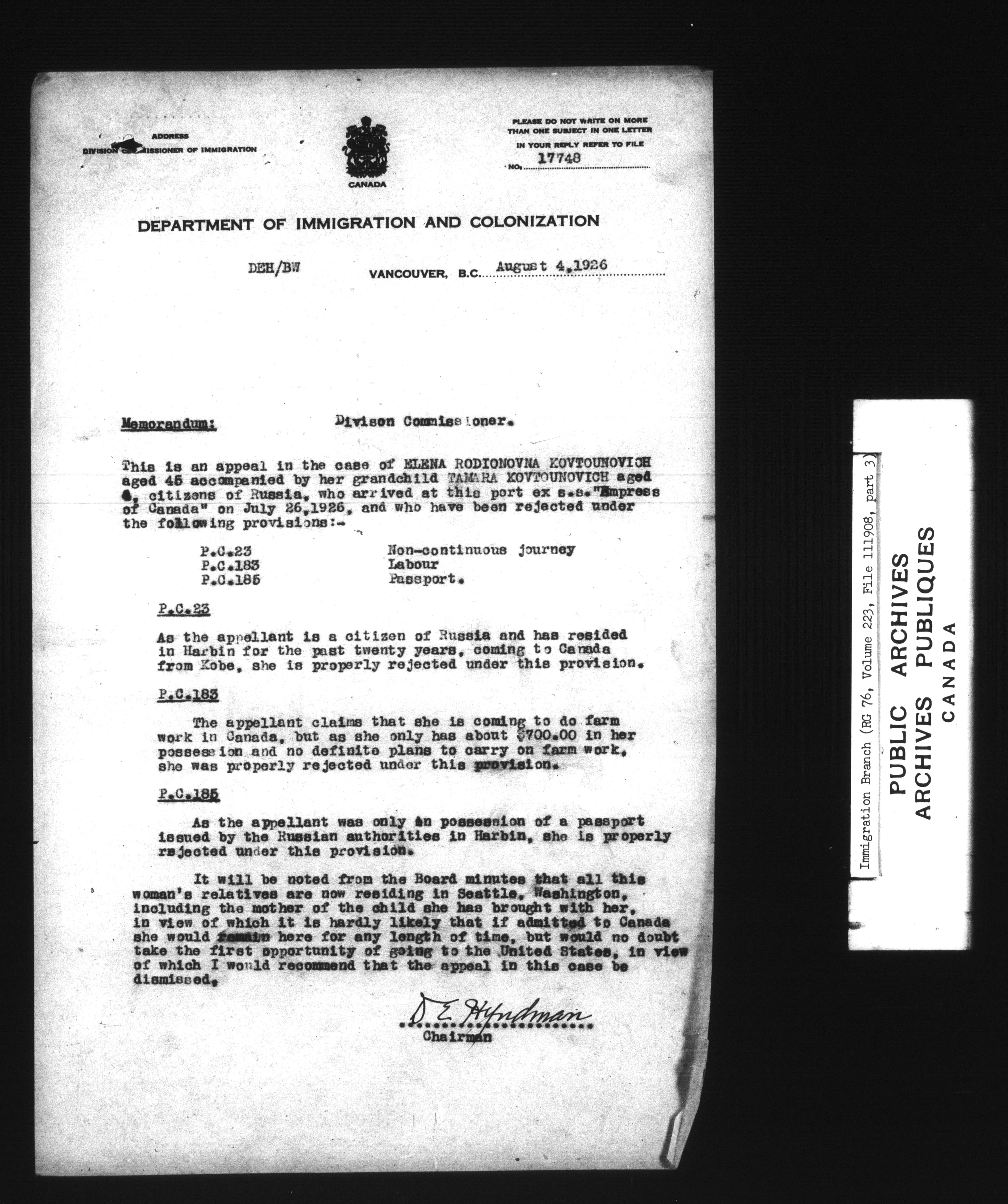 Subject, policy and case files in the First Central Registry series of the Immigration Program, 1892-1950 - 7373