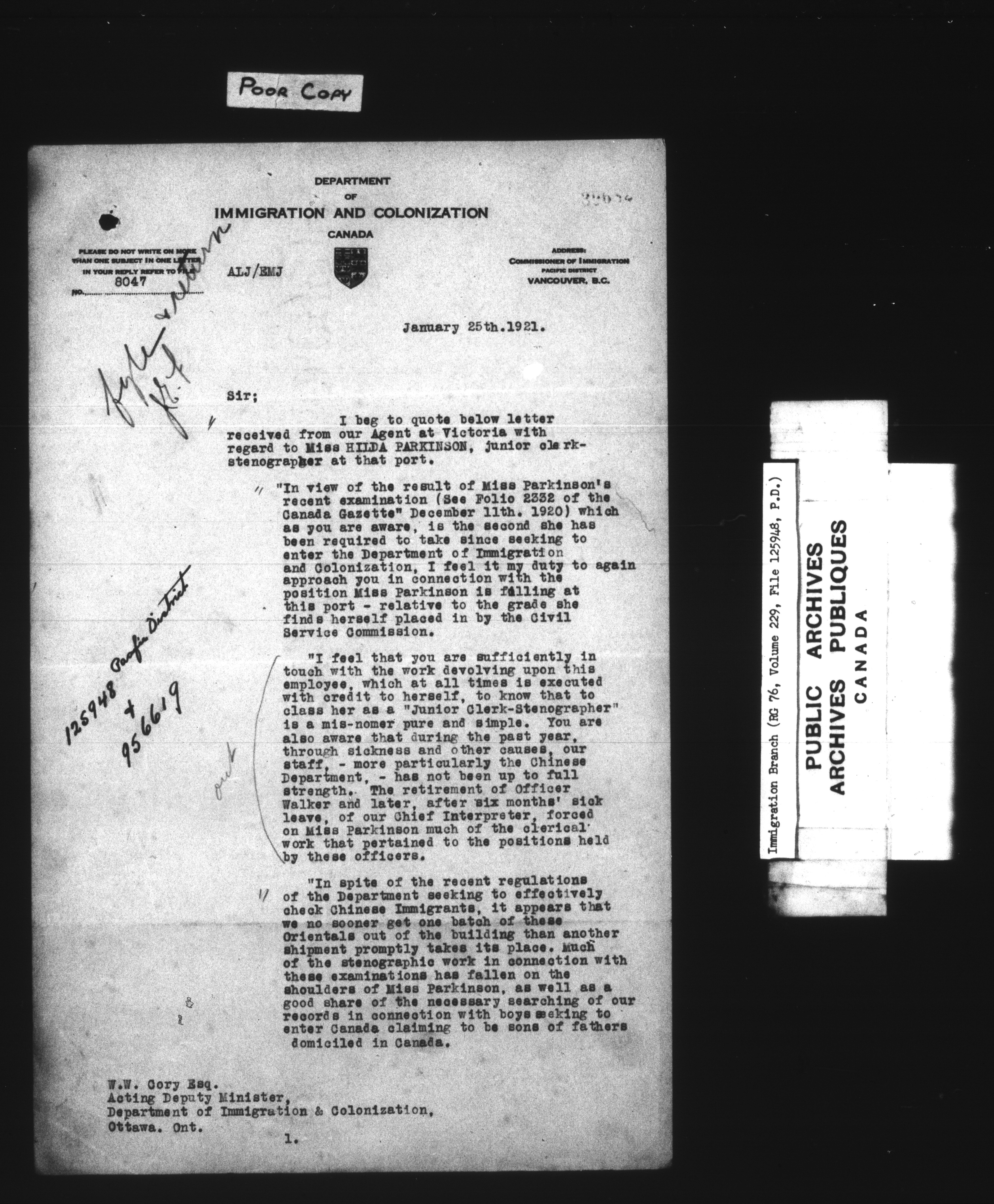 Subject, policy and case files in the First Central Registry series of the Immigration Program, 1892-1950 - 7377