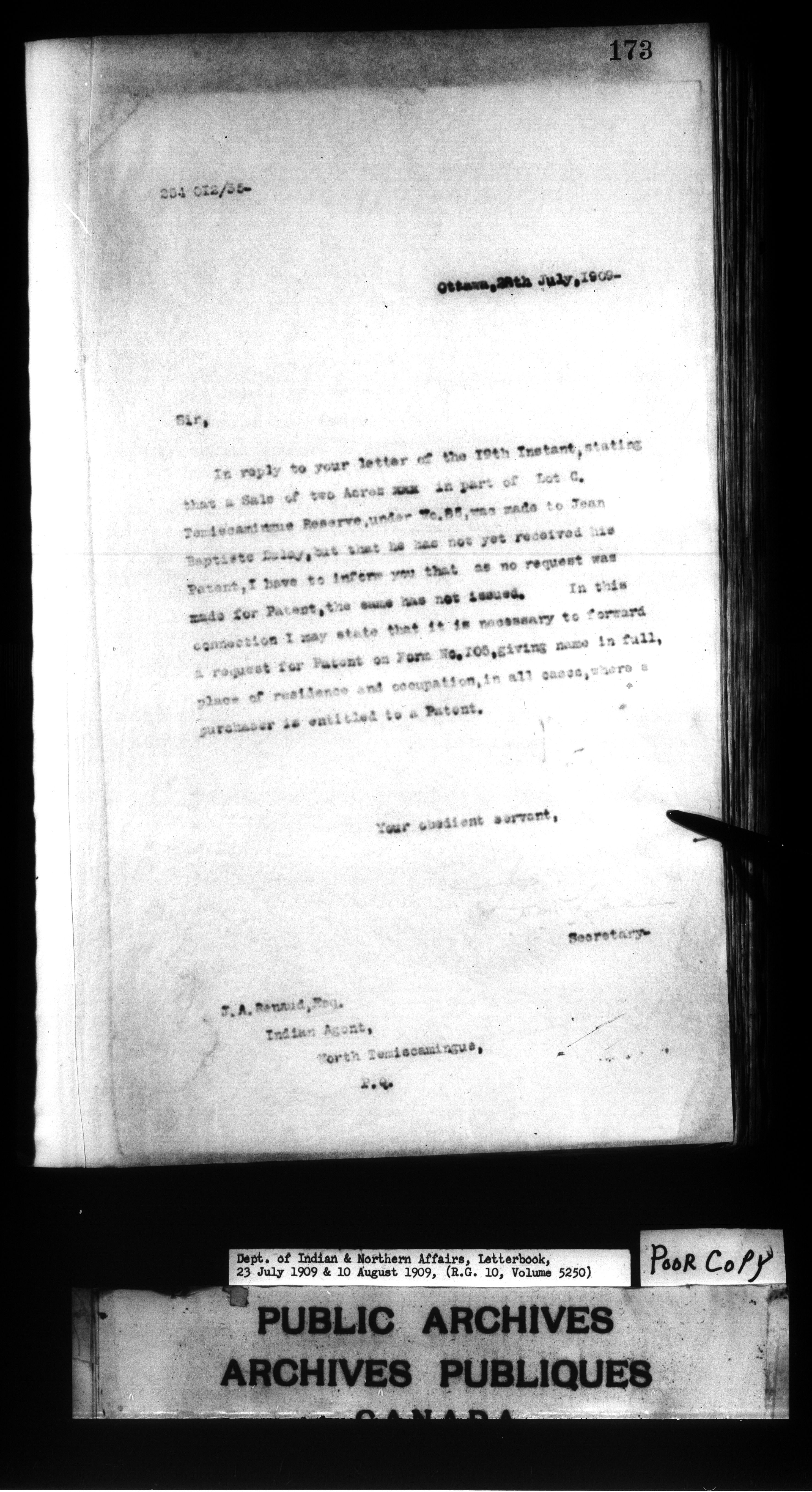 Department of Indian Affairs : Letterbooks of out-going correspondence relating to the administration of Indian Affairs in both eastern and western Canada, 1871-1920 - 7501